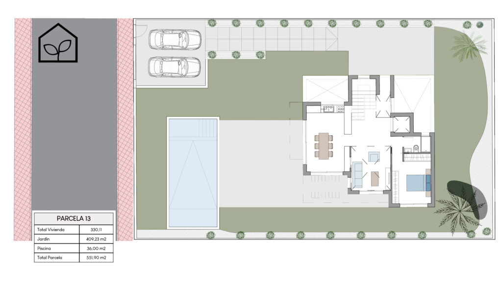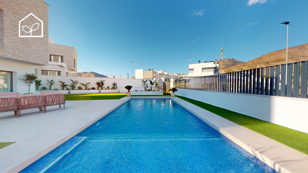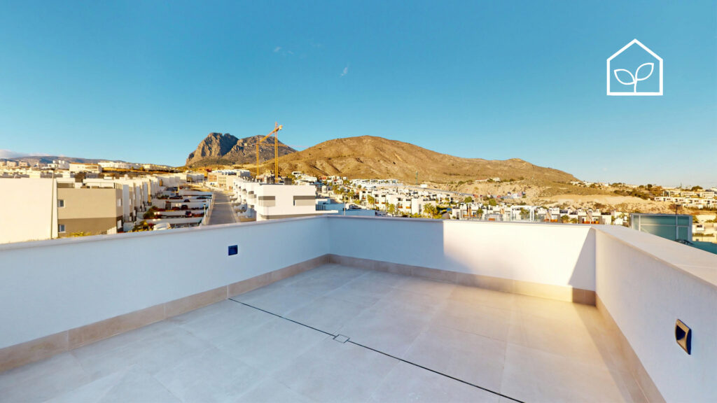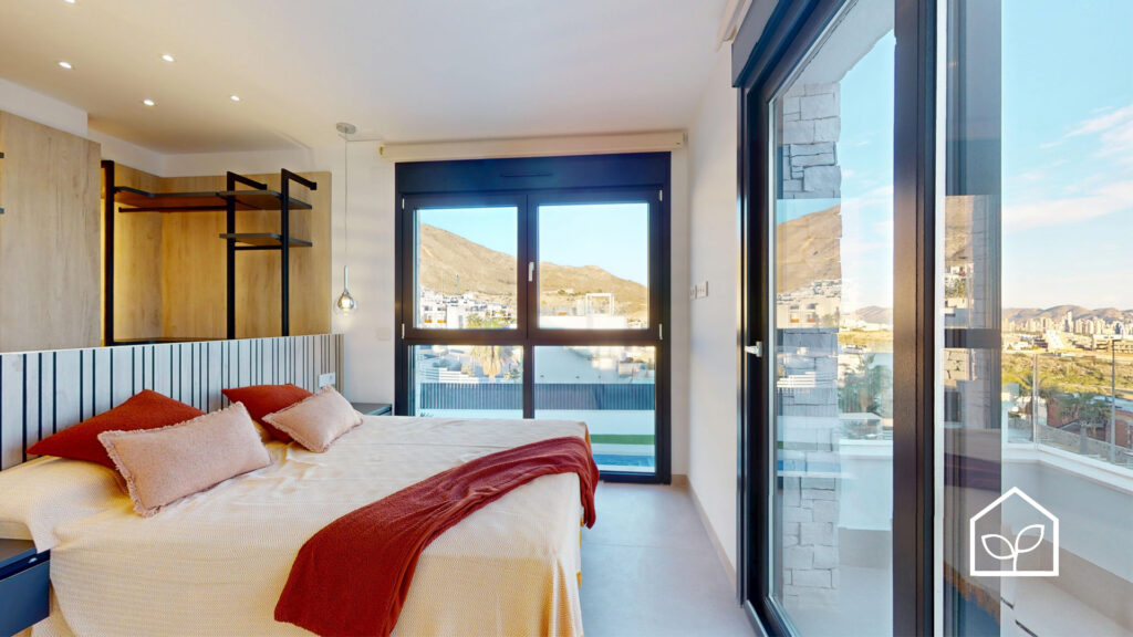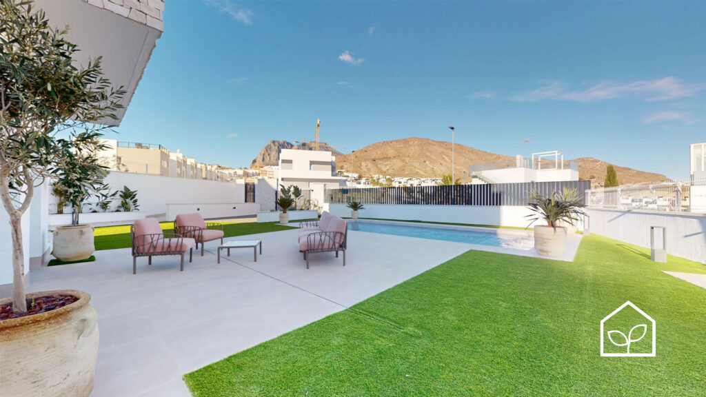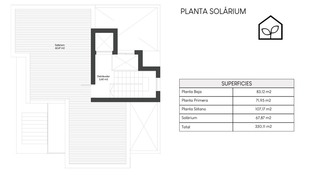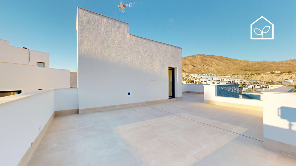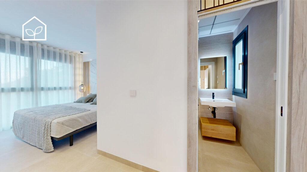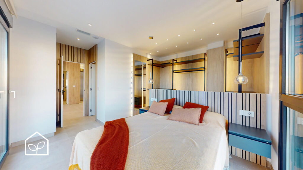 Tre soveværelser, hvoraf to er suiter med eget badeværelse. Det primære soveværelse på 20,35 m² har direkte udgang til en privat terrasse på 5,00 m². Rummelig stue og spiseafdeling med integreret køkken i åben planløsning på 49,64 m². Tagsolarium med et areal på 62,47 m². I alt tre badeværelser. Underetagen kan tilvælges mod en merpris på 79.000 euro og omfatter en ekstra opholdsstue på 74,22 m², to engelske patioer på 17,14 m² og 8,38 m² samt et trapperepos på 7,43 m². Projektet giver desuden mulighed for at indrette et fjerde soveværelse, et ekstra badeværelse, et bryggers og et multirum i underetagen. Elevator kan tilvælges mod en merpris på 30.000 euro. Anlagt grund på 519,81 m² med privat swimmingpool på 36,00 m².
