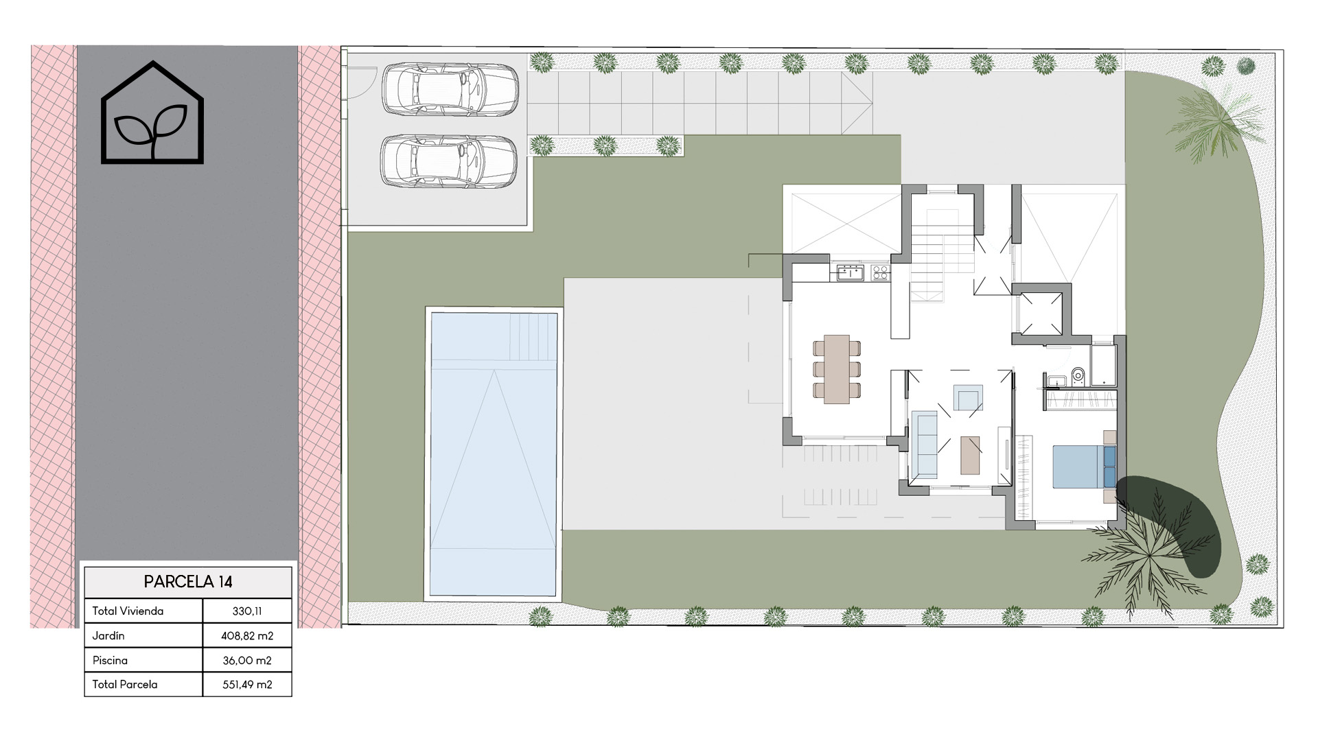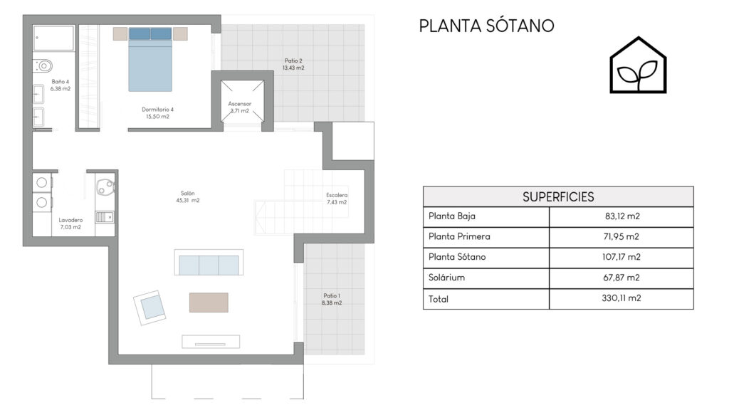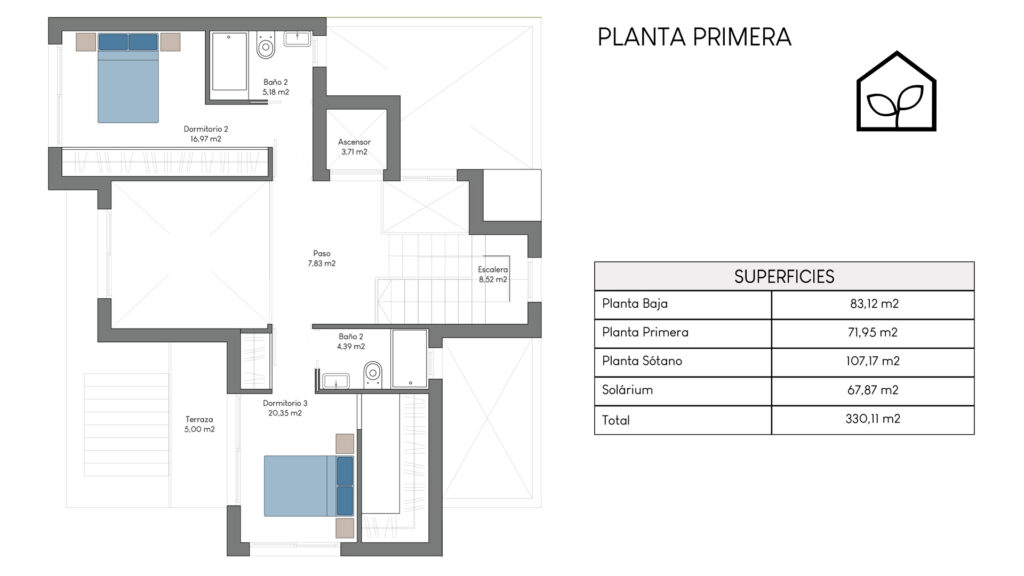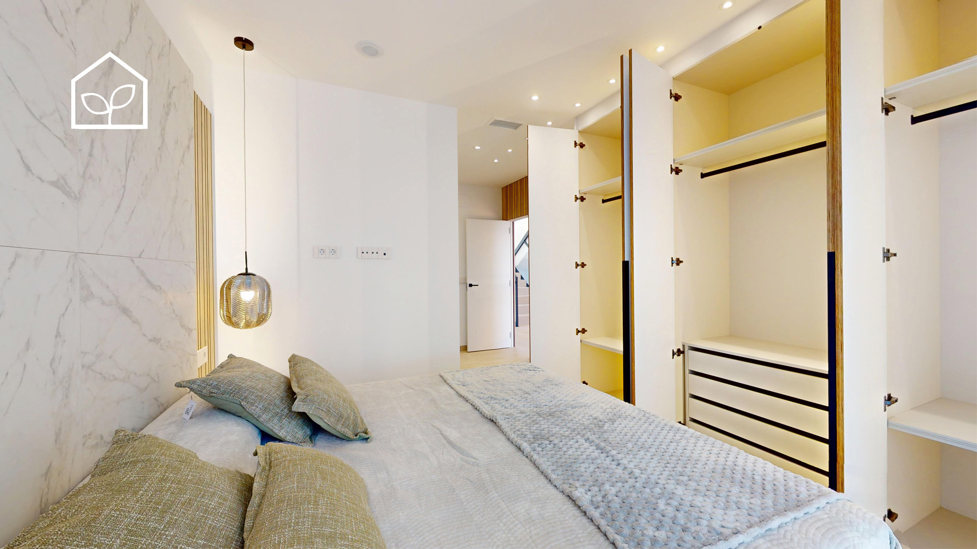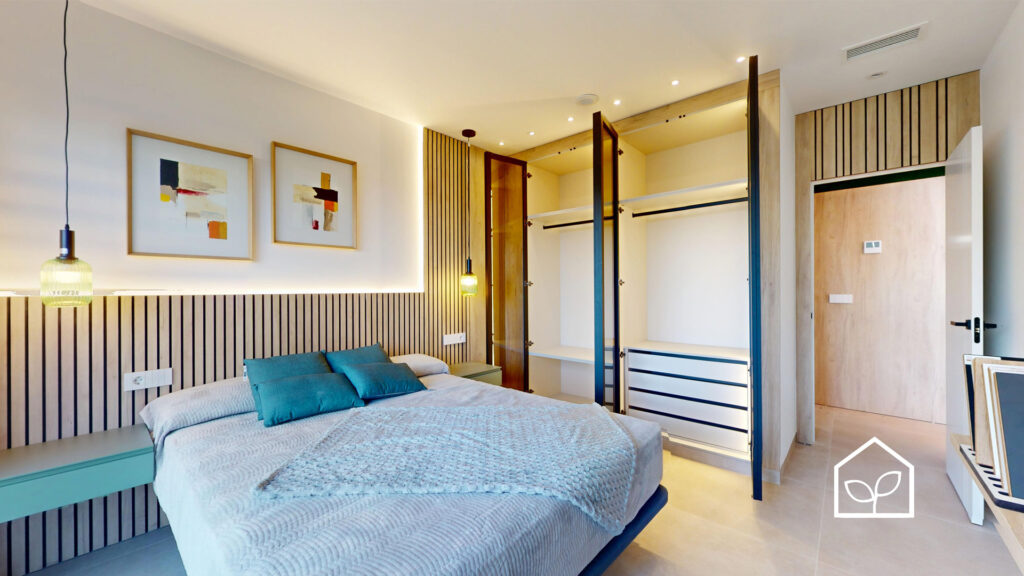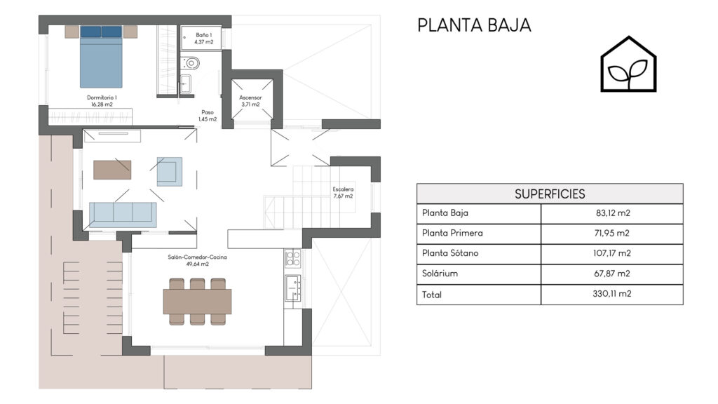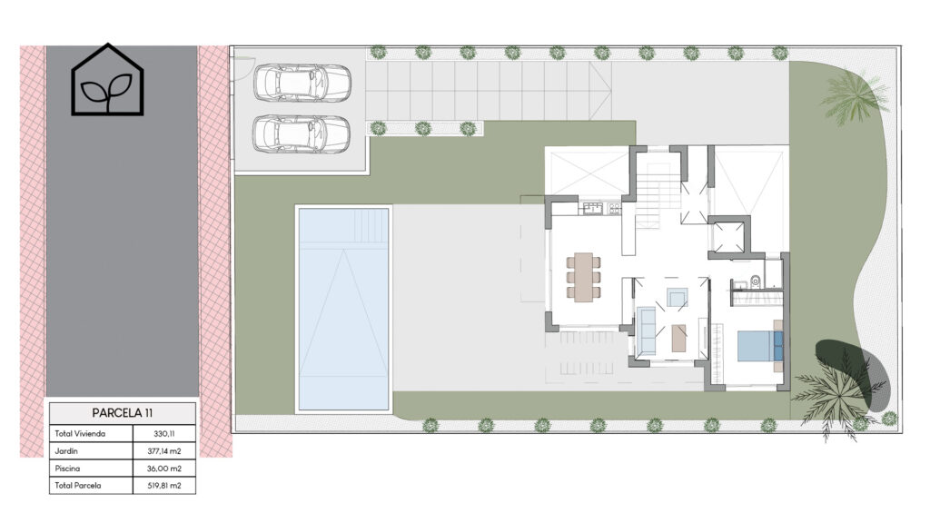 Tre soveværelser, hvoraf to er suiter med eget badeværelse. Det primære soveværelse på 20,35 m² har direkte udgang til en privat terrasse på 5,00 m². Rummelig stue og spiseafdeling med integreret køkken i åben planløsning på 49,64 m². Tagsolarium med et areal på 62,47 m². I alt tre badeværelser. Underetagen kan tilvælges mod en merpris på 79.000 euro og omfatter en ekstra opholdsstue på 74,22 m², to engelske patioer på 17,14 m² og 8,38 m² samt et trapperepos på 7,43 m². Projektet giver desuden mulighed for at indrette et fjerde soveværelse, et ekstra badeværelse, et bryggers og et multirum i underetagen. Elevator kan tilvælges mod en merpris på 30.000 euro. Anlagt grund på 519,81 m² med privat swimmingpool på 36,00 m².