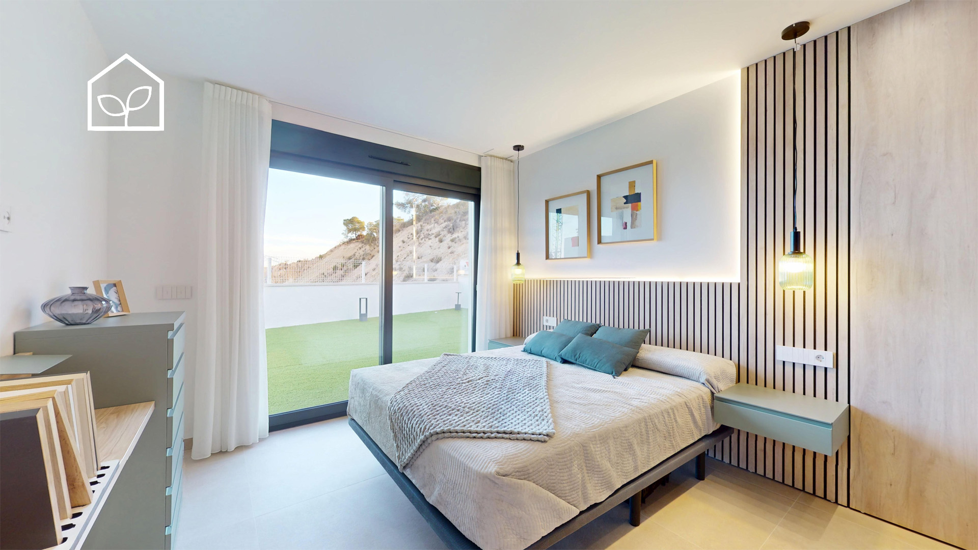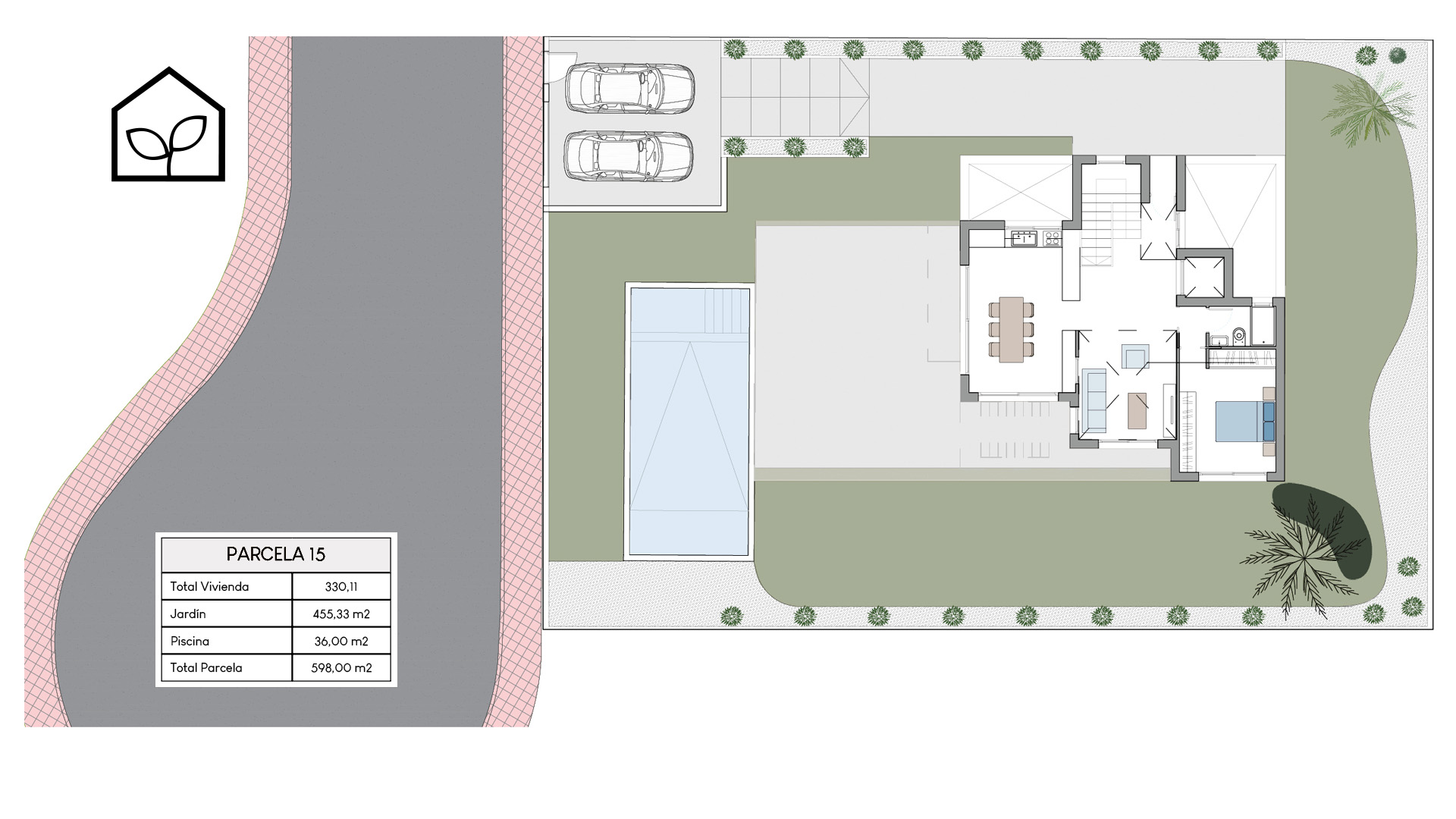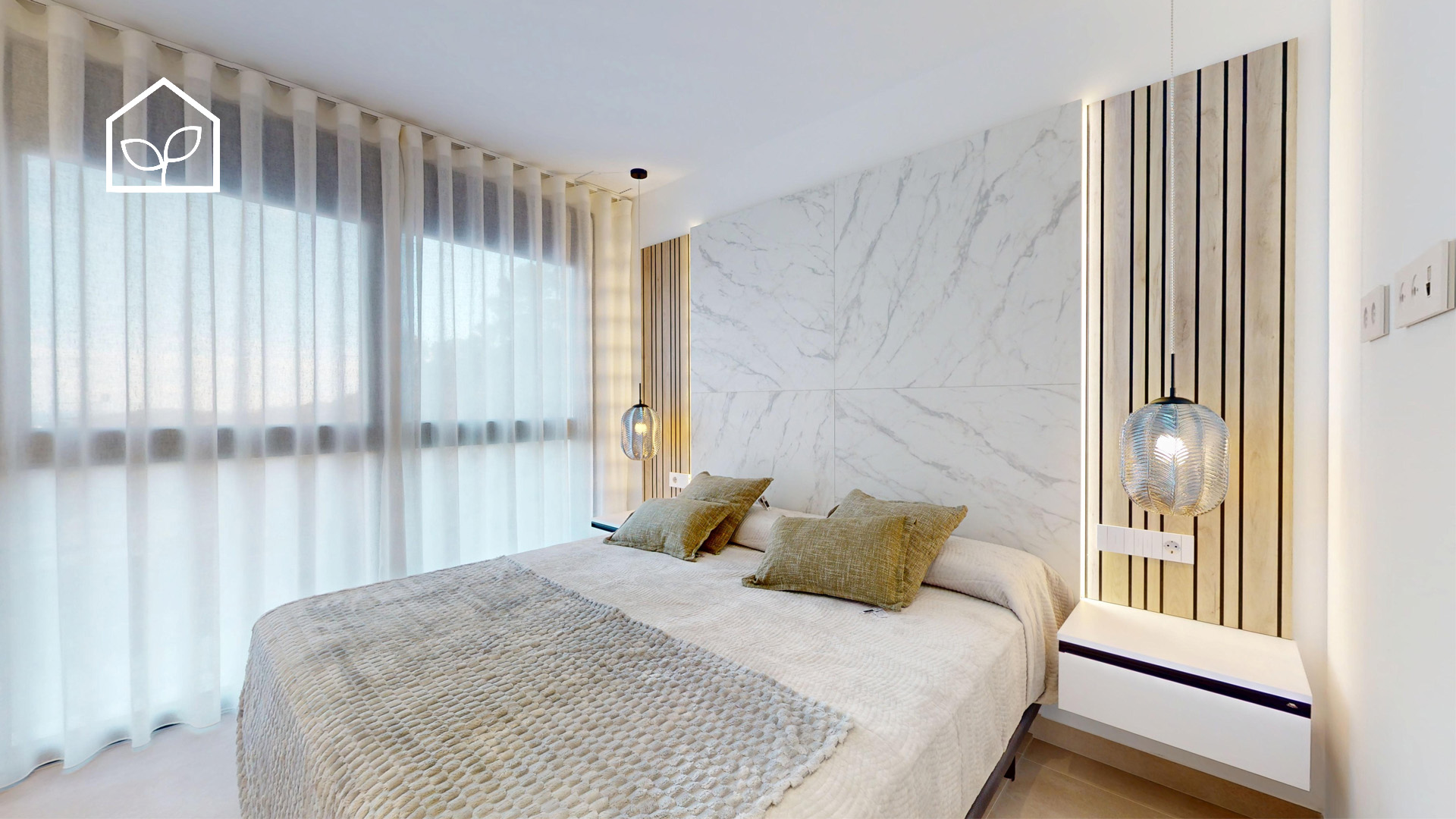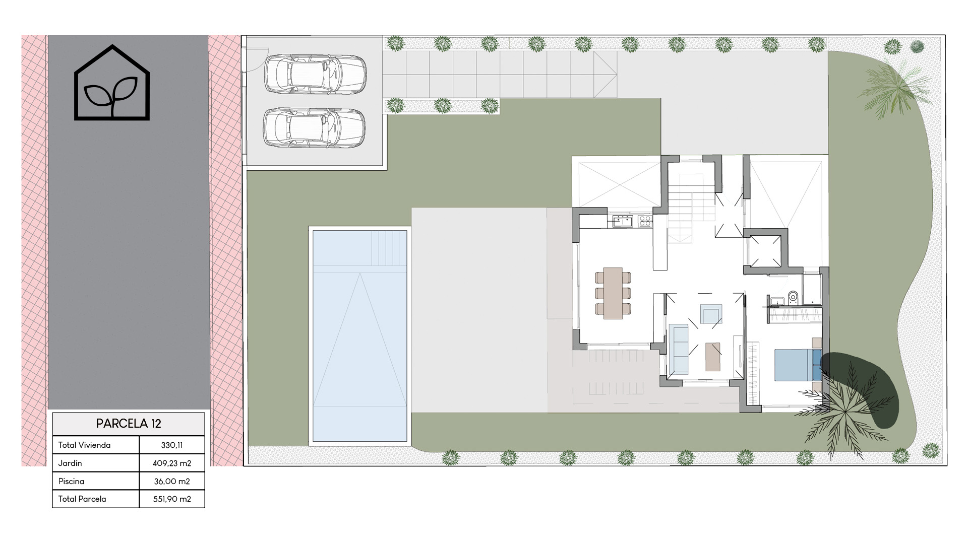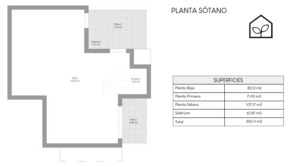 Tre soveværelser, hvoraf to er suiter med eget badeværelse. Det primære soveværelse på 20,35 m² har direkte udgang til en privat terrasse på 5,00 m². Rummelig stue og spiseafdeling med integreret køkken i åben planløsning på 49,64 m². Tagsolarium med et areal på 62,47 m². I alt tre badeværelser. Underetagen kan tilvælges mod en merpris på 79.000 euro og omfatter en ekstra opholdsstue på 74,22 m², to engelske patioer på 17,14 m² og 8,38 m² samt et trapperepos på 7,43 m². Projektet giver desuden mulighed for at indrette et fjerde soveværelse, et ekstra badeværelse, et bryggers og et multirum i underetagen. Elevator kan tilvælges mod en merpris på 30.000 euro. Anlagt grund på 519,81 m² med privat swimmingpool på 36,00 m².
