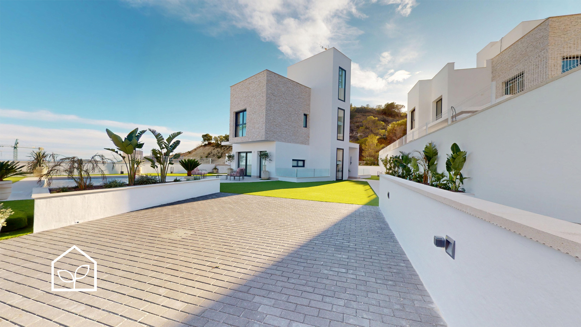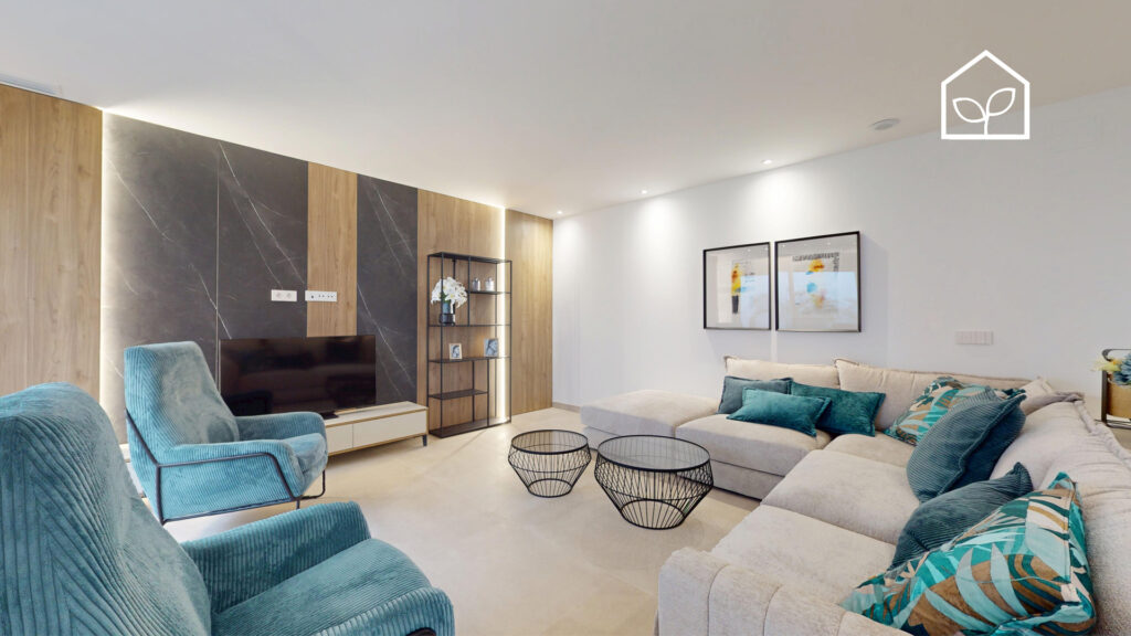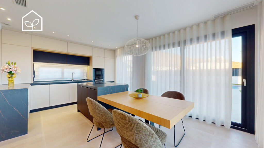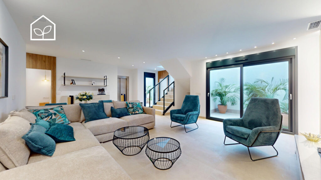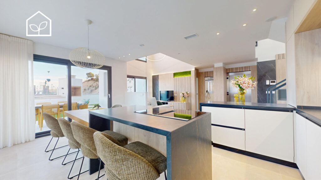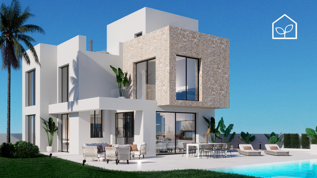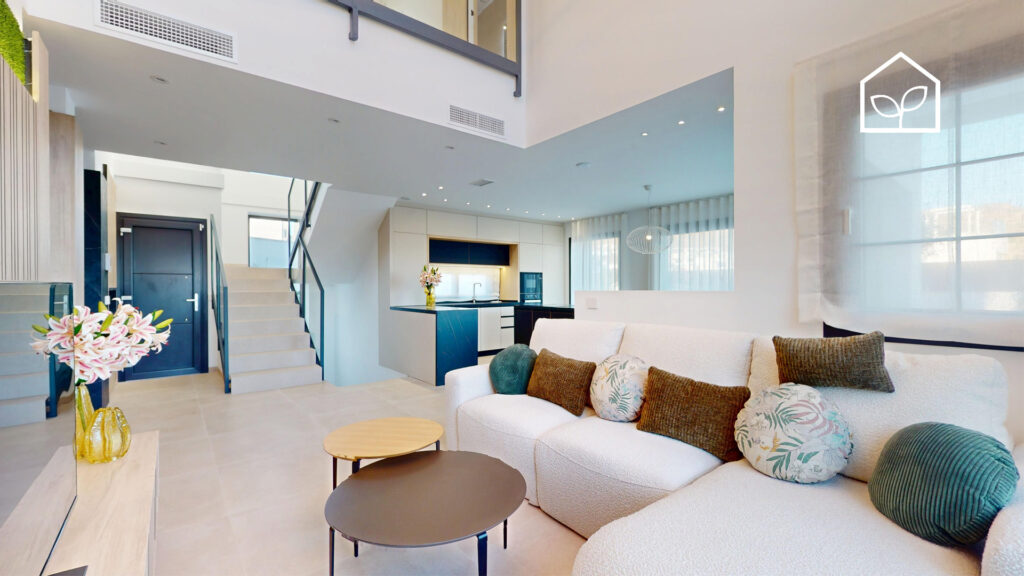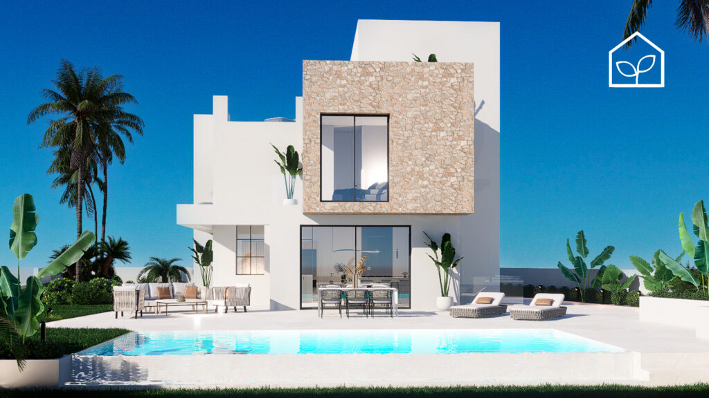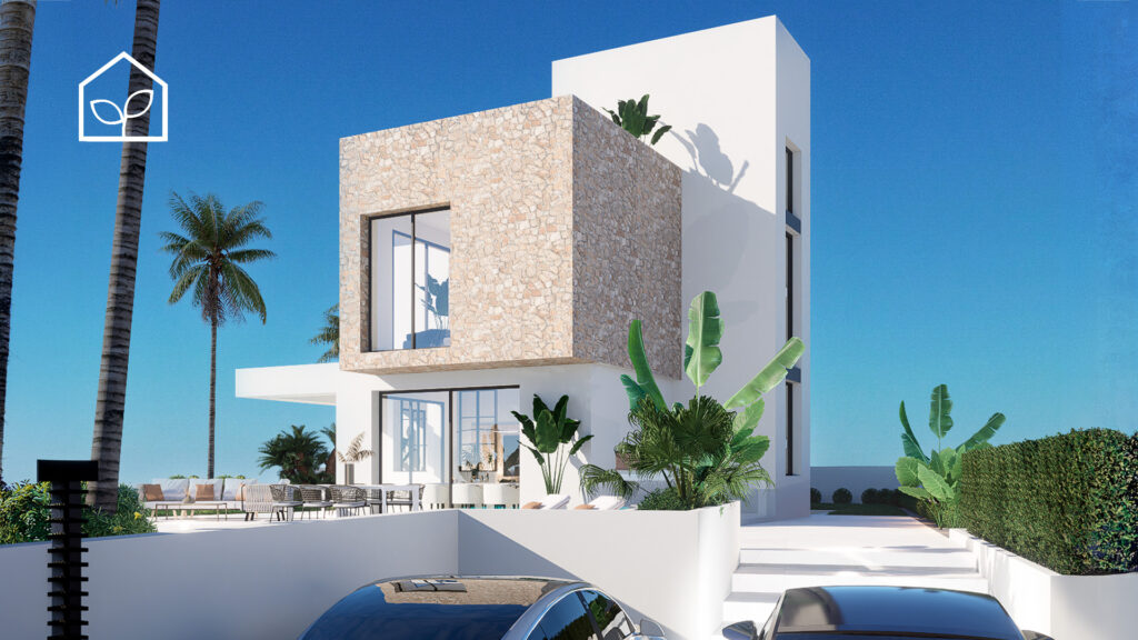 De indvendige rum er organiseret efter princippet om åben planløsning med en glidende overgang mellem boligens interiør og de udendørs opholdszoner. Store panoramiske skydedørspartier i glas skaber en visuel og funktionel forbindelse mellem opholdsarealerne og terrasserne, haven og poolområdet, hvilket forstærker oplevelsen af rumlig sammenhæng og naturligt lysindfald. Villaernes eksteriør er projekteret som en fuldgyldig forlængelse af boligen: haven, de rummelige terrasser og tagsolariumet danner et flerniveau system af udendørs arealer til afslapning og privatliv. Swimmingpoolen og den tilstødende terrasse udgør grundens centrale komposition og fremstår som et nøgleelement i den middelhavske livsstil. Interiøret er udformet i en moderne minimalistisk æstetik med fokus på funktionalitet, rene linjer og en neutral materialepalet. Planløsningen er organiseret med en tydelig opdeling mellem dagzone og natzone, hvilket sikrer en komfortabel boligdisponering. Badeværelserne er udført i en moderne arkitektonisk stil med storformat keramik, integrerede sanitetsløsninger og bruseafskærmninger i glas.