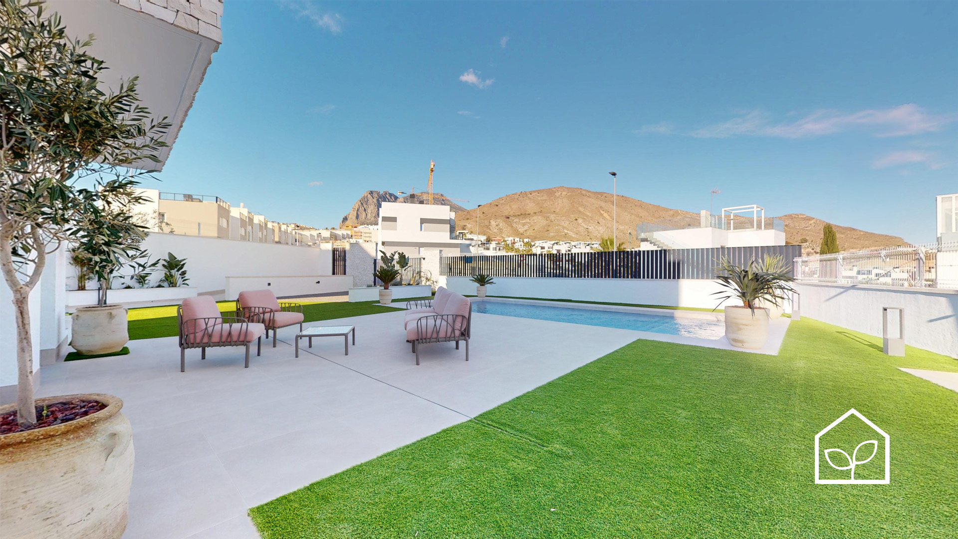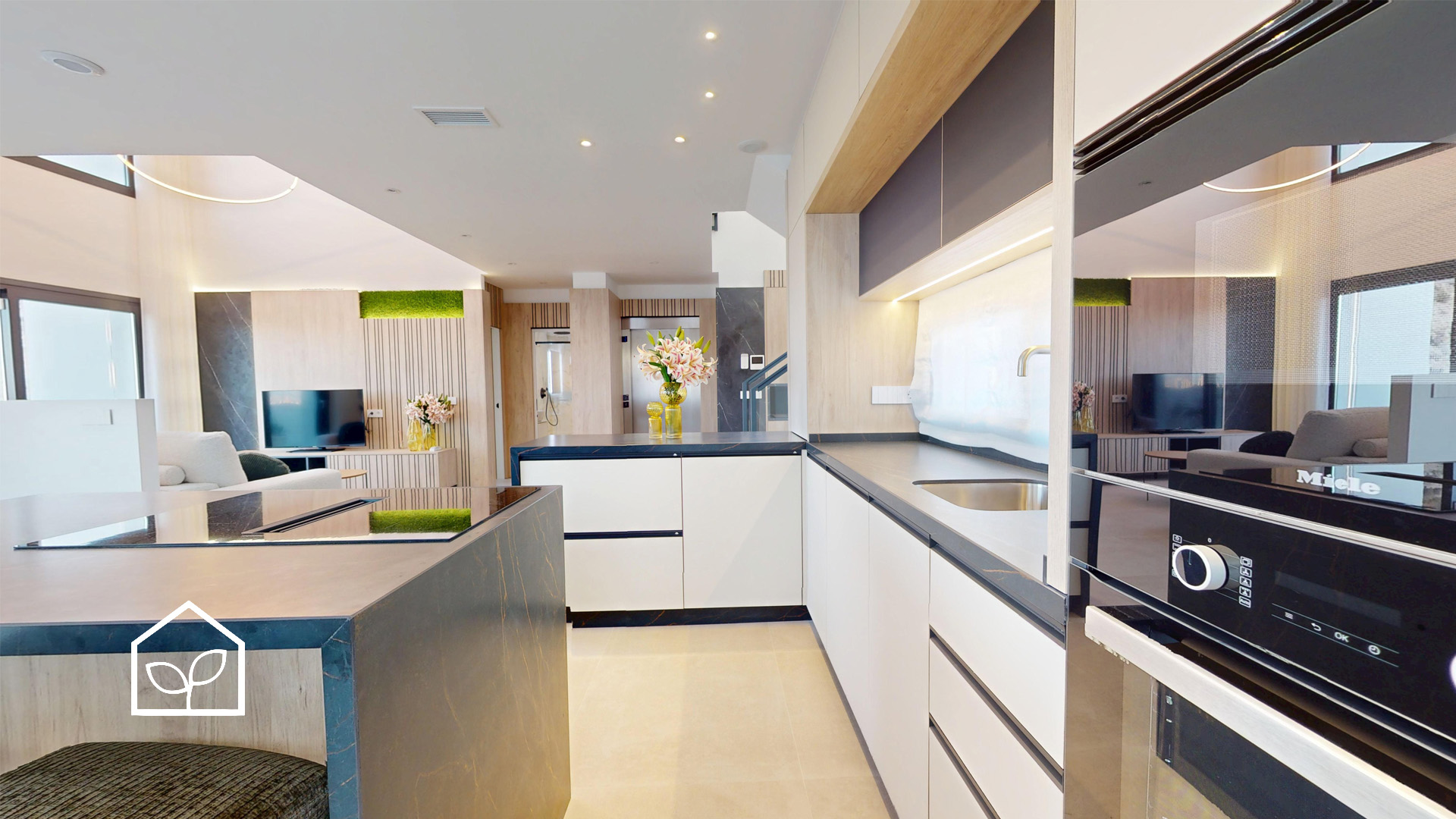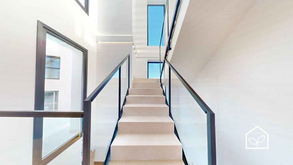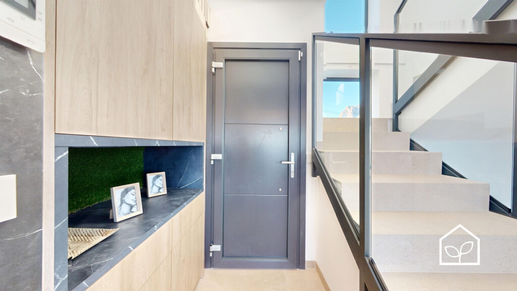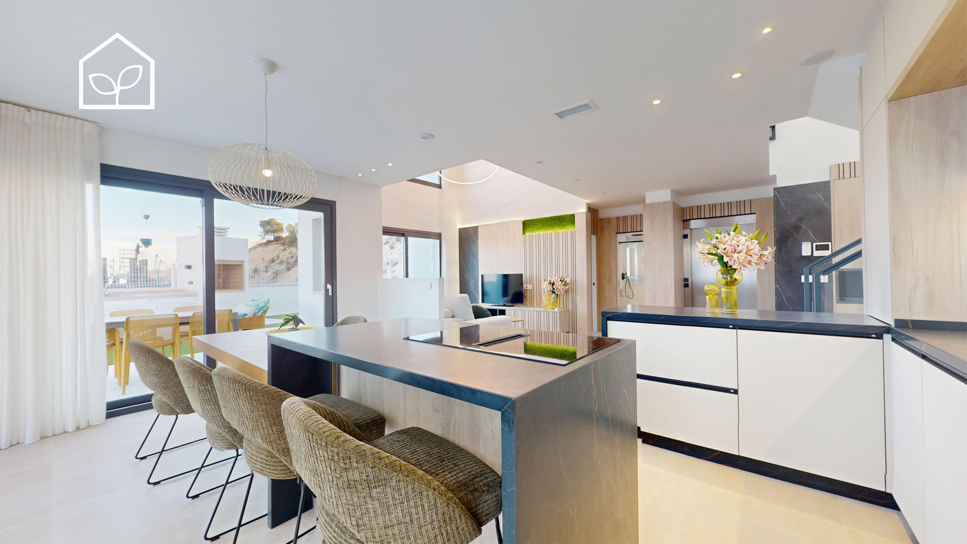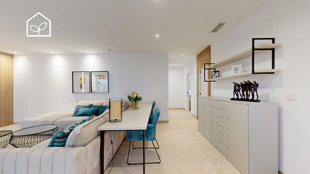 De indvendige rum er organiseret efter princippet om åben planløsning med en glidende overgang mellem boligens interiør og de udendørs opholdszoner. Store panoramiske skydedørspartier i glas skaber en visuel og funktionel forbindelse mellem opholdsarealerne og terrasserne, haven og poolområdet, hvilket forstærker oplevelsen af rumlig sammenhæng og naturligt lysindfald. Villaernes eksteriør er projekteret som en fuldgyldig forlængelse af boligen: haven, de rummelige terrasser og tagsolariumet danner et flerniveau system af udendørs arealer til afslapning og privatliv. Swimmingpoolen og den tilstødende terrasse udgør grundens centrale komposition og fremstår som et nøgleelement i den middelhavske livsstil. Interiøret er udformet i en moderne minimalistisk æstetik med fokus på funktionalitet, rene linjer og en neutral materialepalet. Planløsningen er organiseret med en tydelig opdeling mellem dagzone og natzone, hvilket sikrer en komfortabel boligdisponering. Badeværelserne er udført i en moderne arkitektonisk stil med storformat keramik, integrerede sanitetsløsninger og bruseafskærmninger i glas.