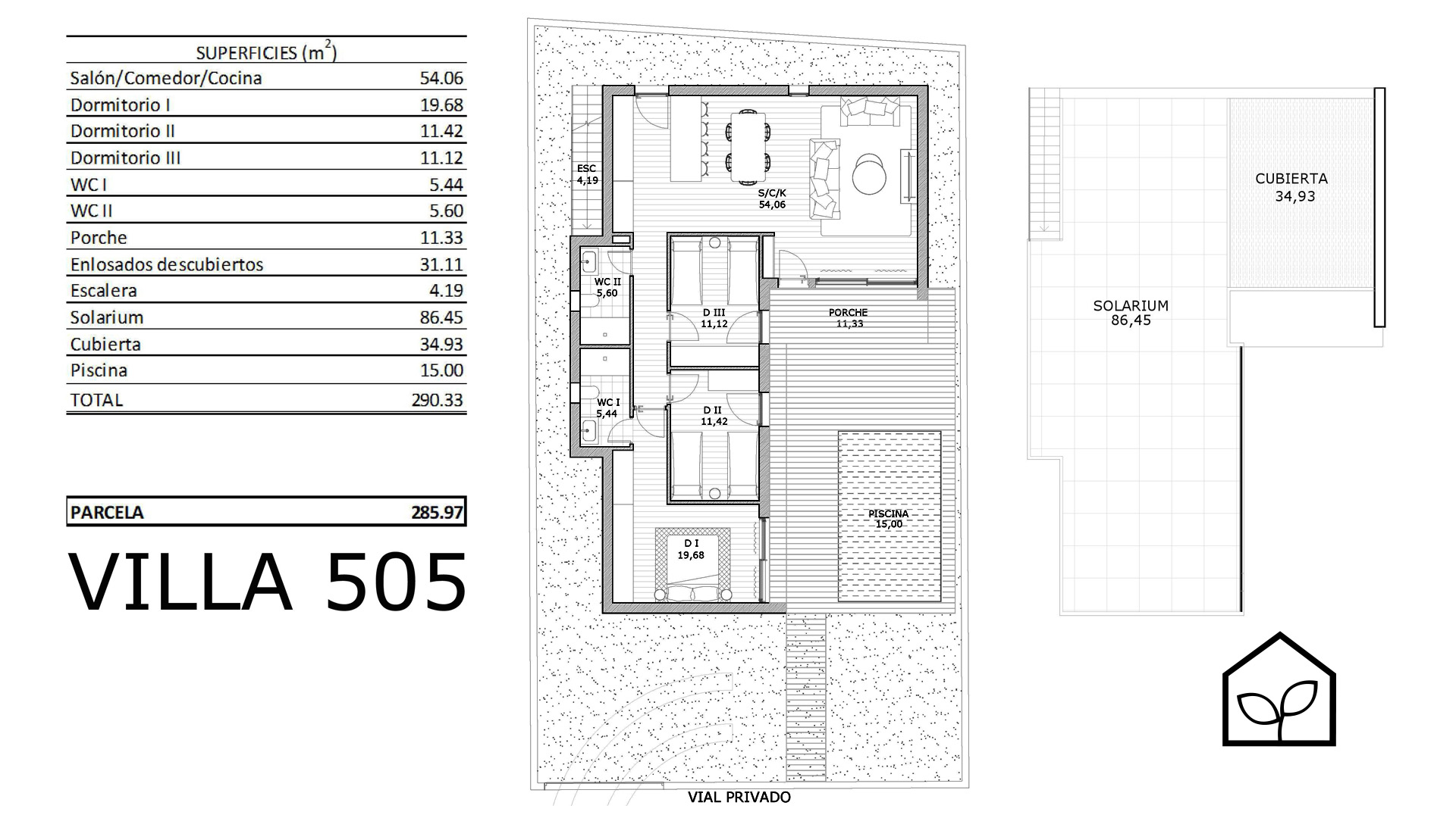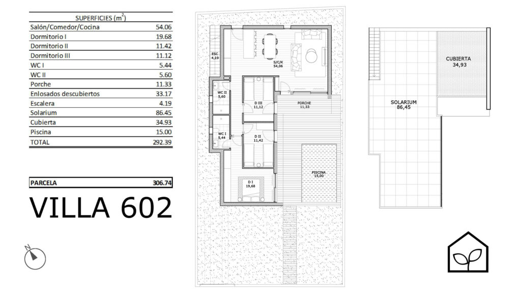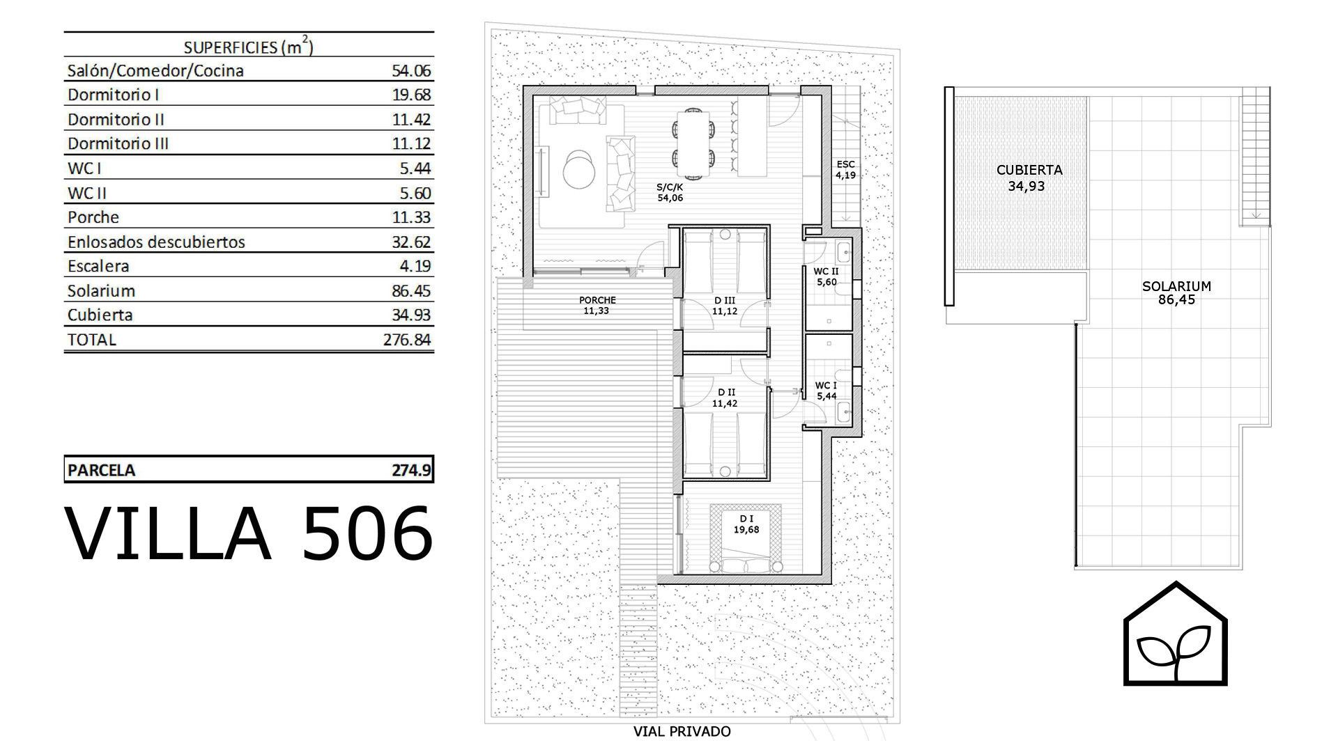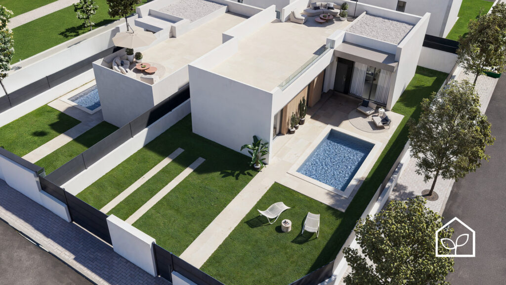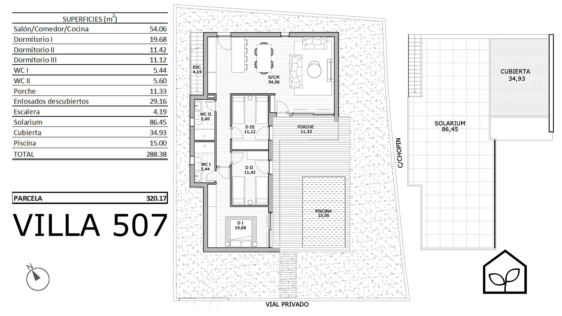 Tre lyse soveværelser. Rummelig stue og spisestue med åbent køkken med et samlet areal på 54,06 m². To komplette badeværelser. Tagterrasse solarium på 86,45 m². Privat pool på 15,00 m². Grunde fra 274,90 til 320,17 m². Hver bolig har parkeringsplads på egen grund.