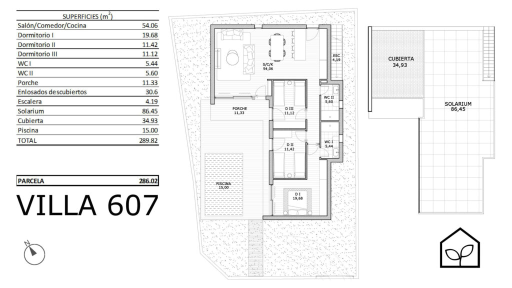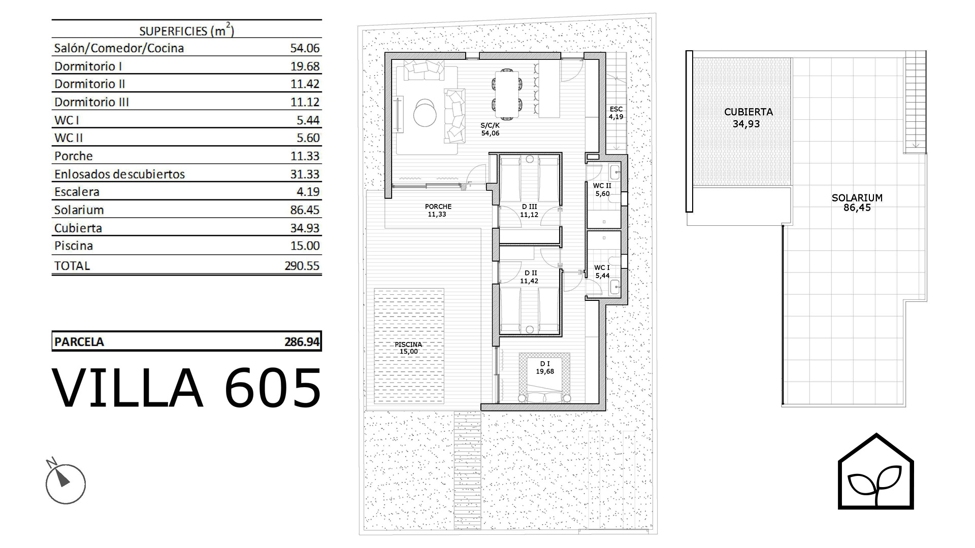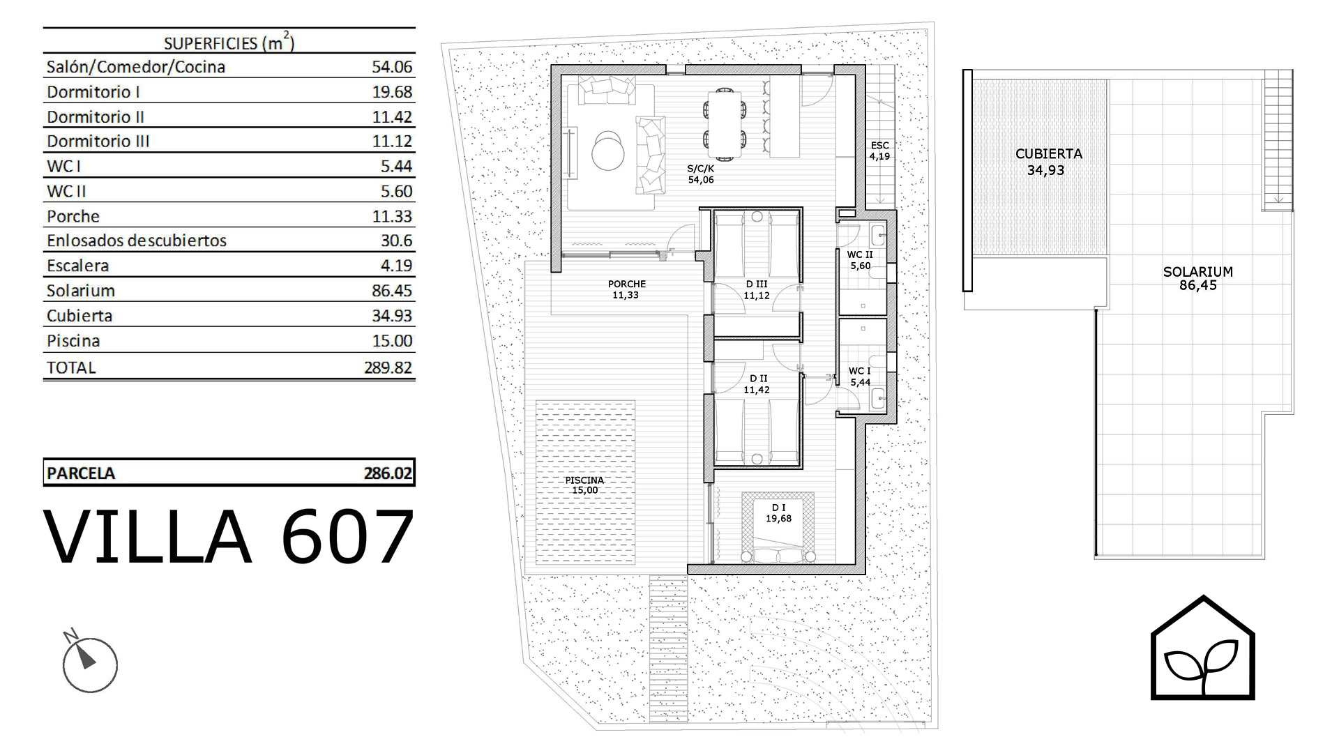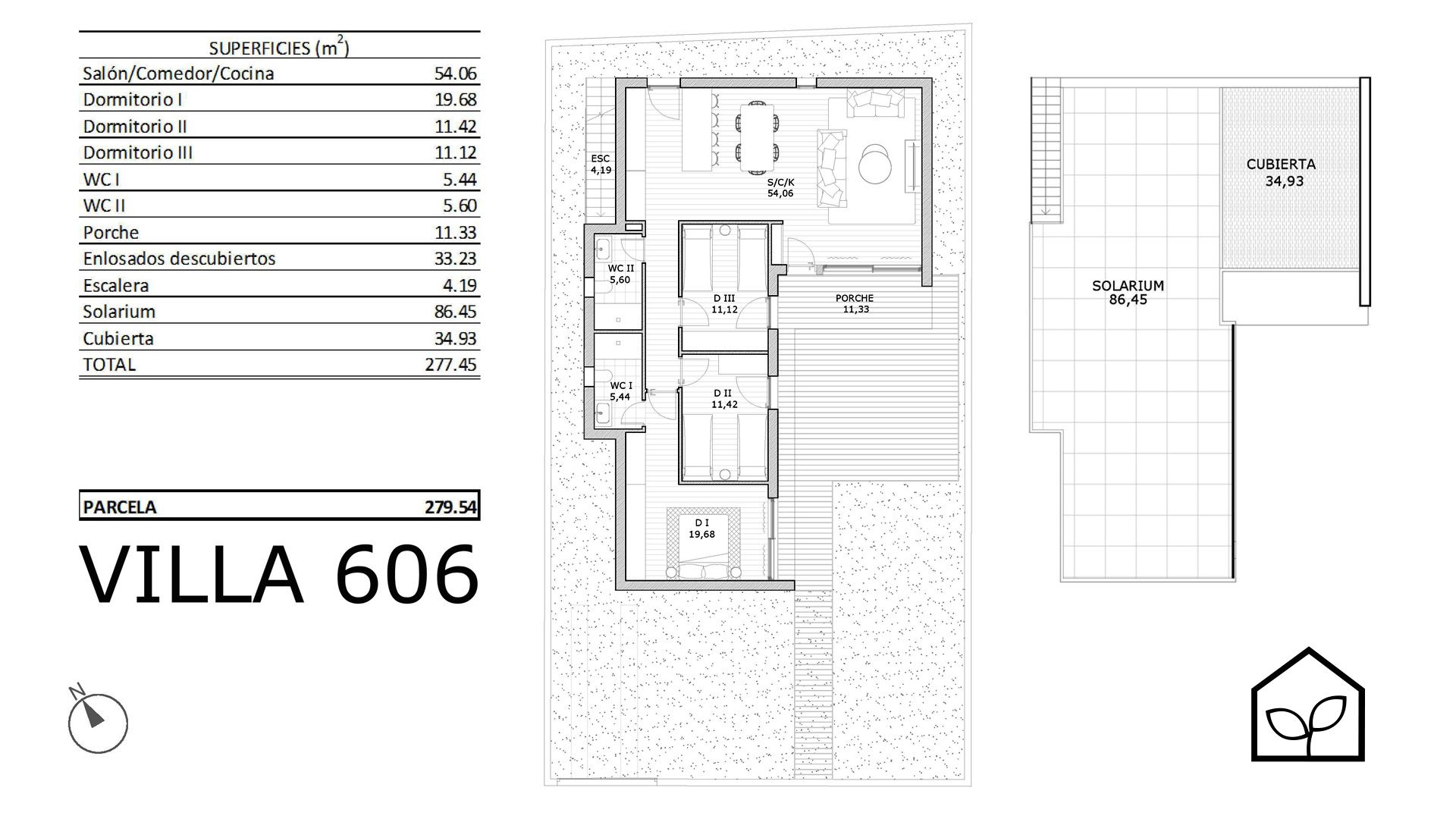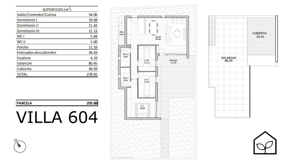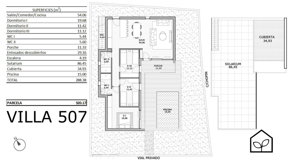 Tre lyse soveværelser. Rummelig stue og spisestue med åbent køkken med et samlet areal på 54,06 m². To komplette badeværelser. Tagterrasse solarium på 86,45 m². Privat pool på 15,00 m². Grunde fra 274,90 til 320,17 m². Hver bolig har parkeringsplads på egen grund.