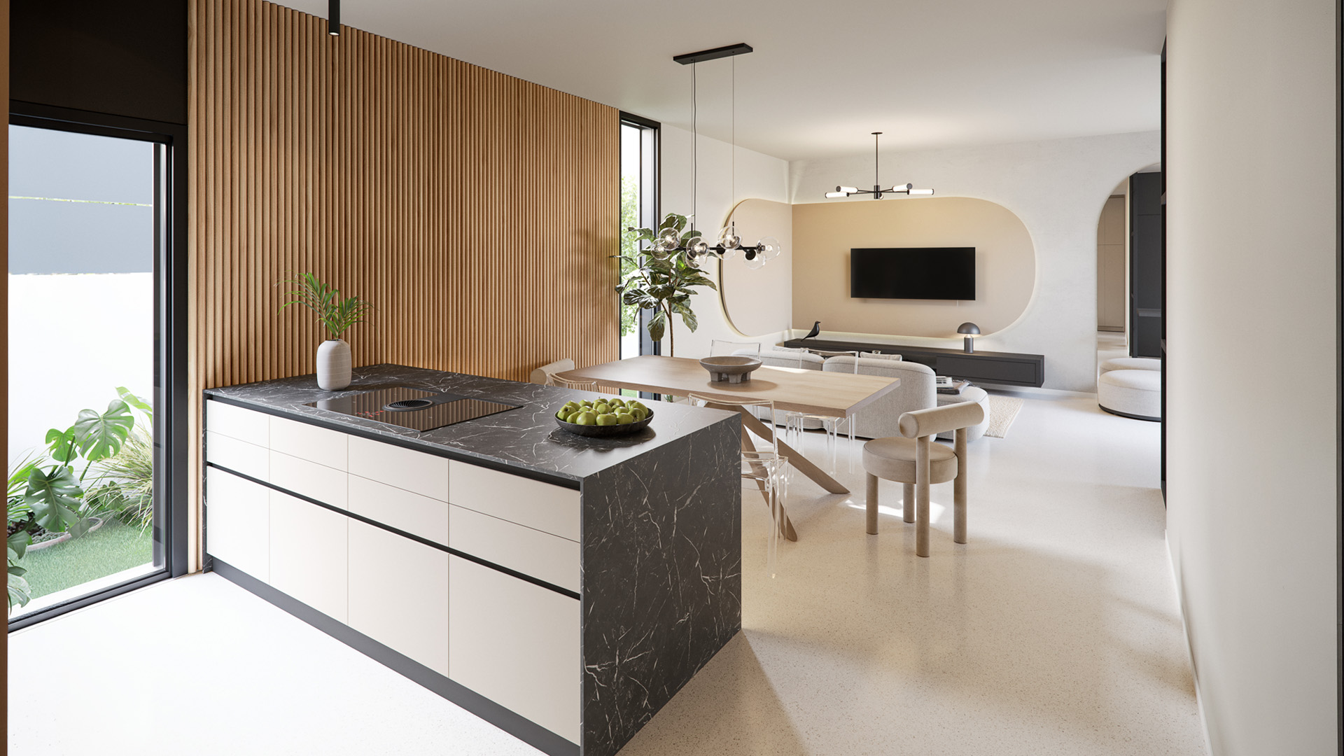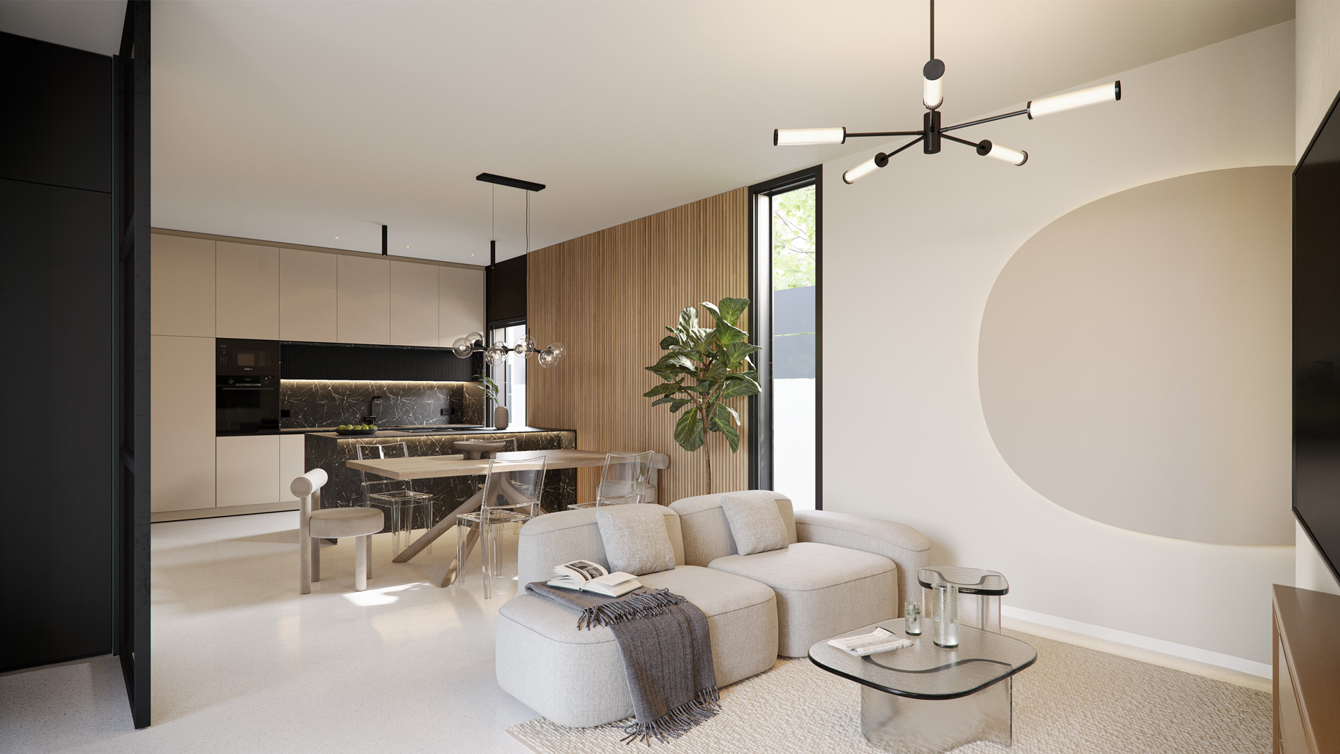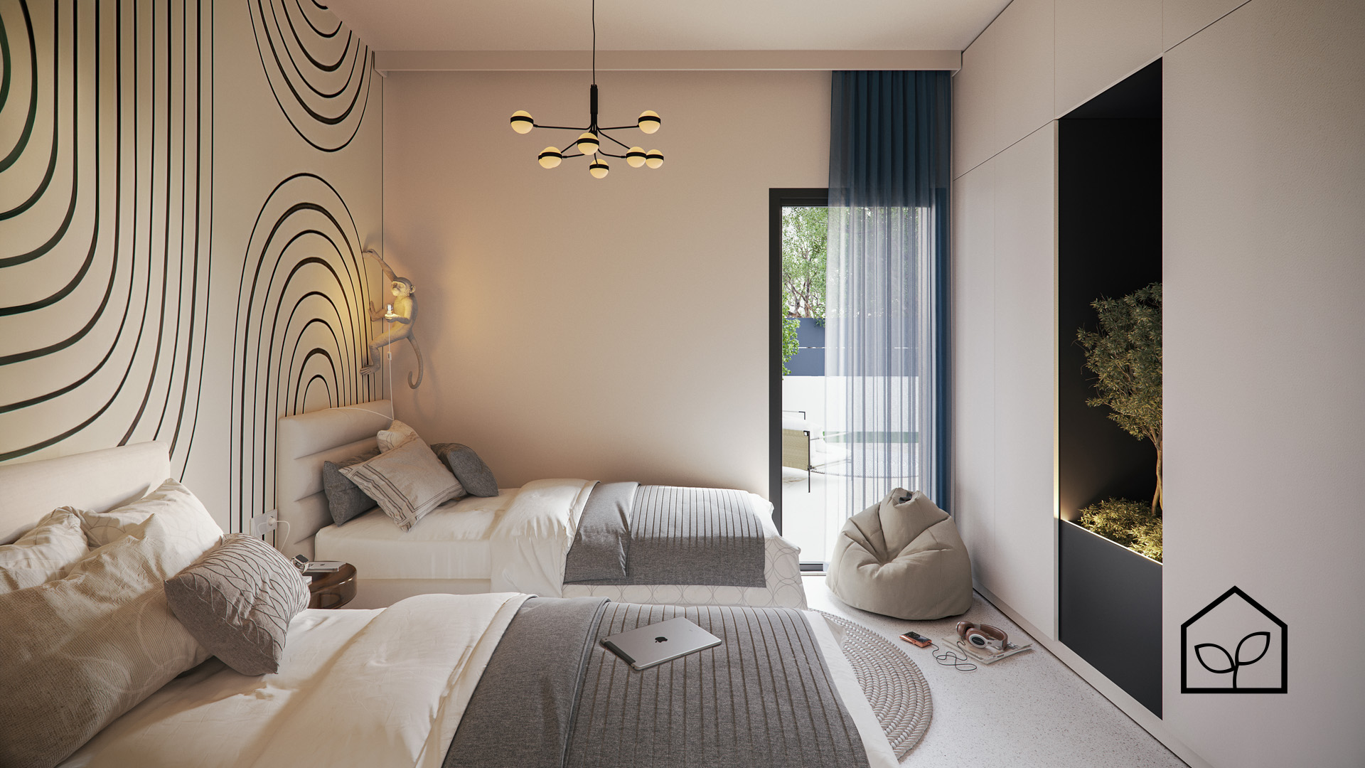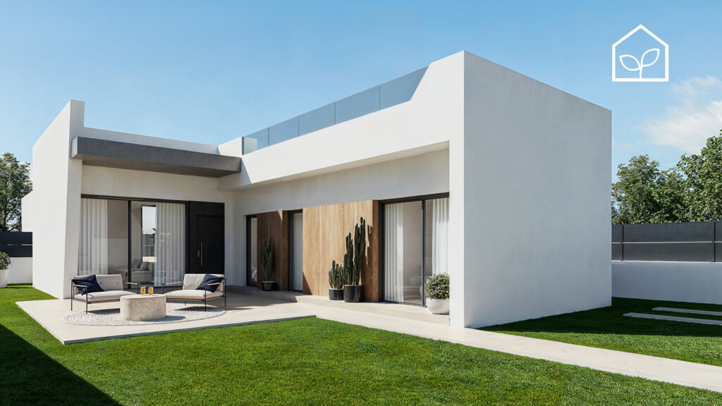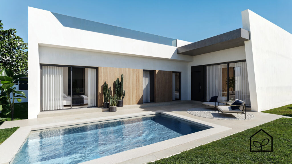Tre lyse soveværelser. Rummelig stue og spisestue med åbent køkken med et samlet areal på 54,06 m². To komplette badeværelser. Tagterrasse solarium på 86,45 m². Privat pool på 15,00 m². Grunde fra 274,90 til 320,17 m². Hver bolig har parkeringsplads på egen grund.