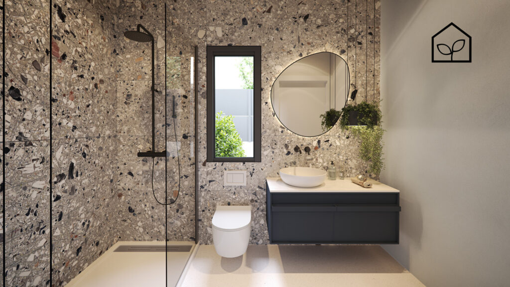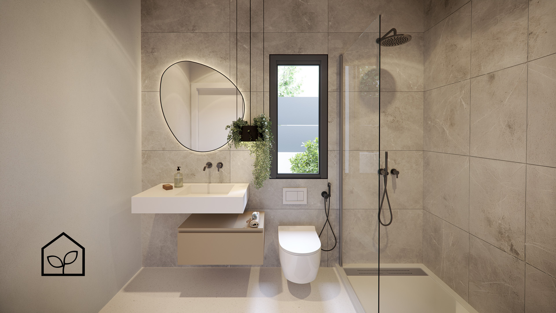Sanitetsudstyr af høj kvalitet med væghængte toiletter brusebakker bademøbler og bruseafskærmninger i begge badeværelser. Varmt brugsvand produceres via en varmepumpe med en beholder på 150 liter. Forberedelse til kanaliseret klimaanlæg. Køkkenet er fuldt udstyret med vask bordplade i porcelæn og induktionskogeplade med integreret emhætte. Opholdsrum har TV og telefonudtag kabel TV antenne og video dørtelefon.