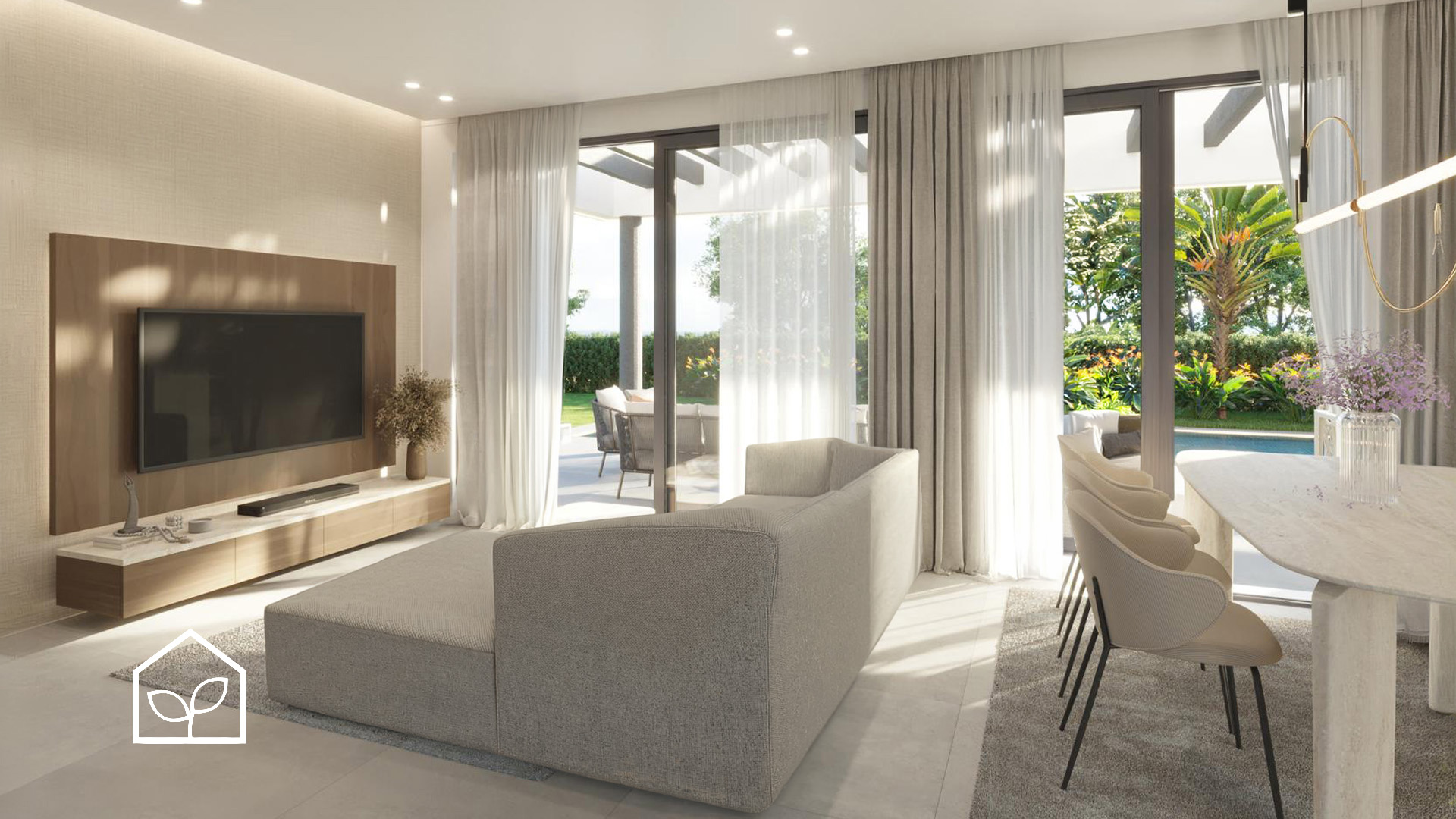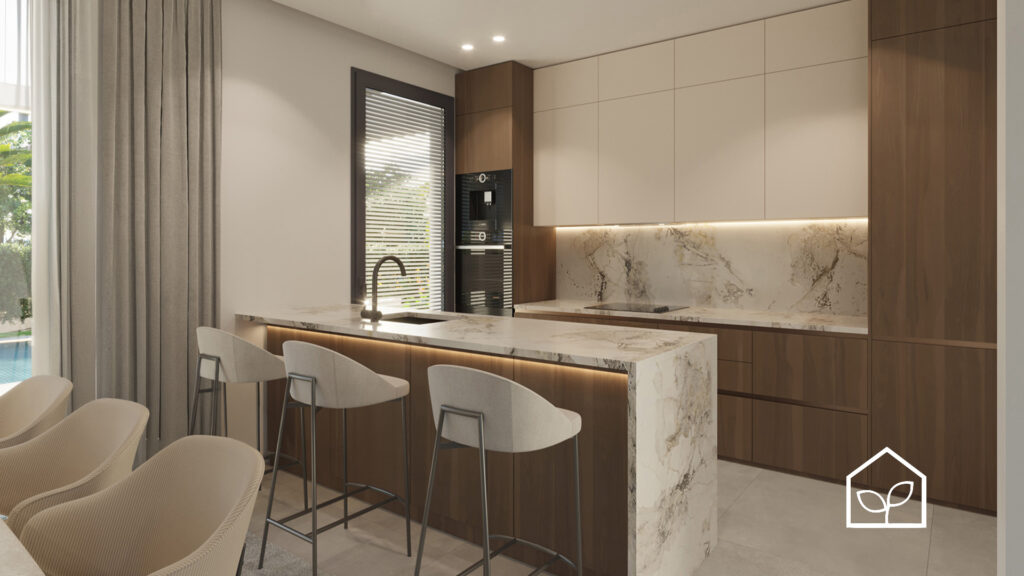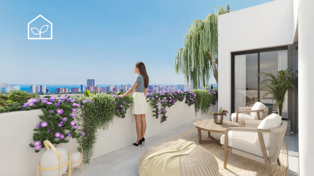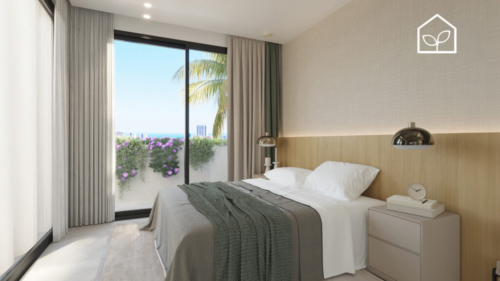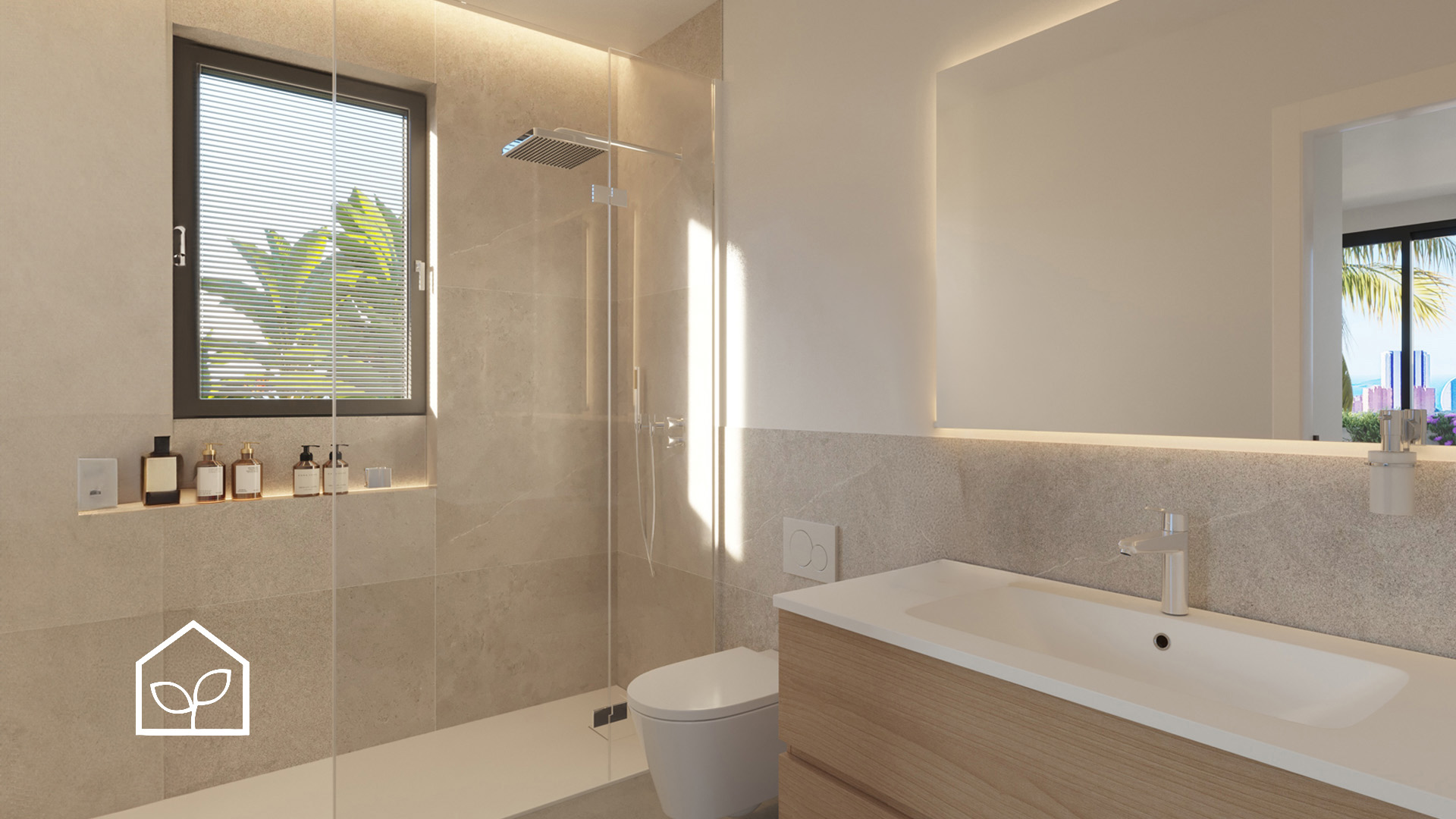 Zwei elegante Schlafzimmer, darunter eine Master-Suite mit eigenem Bad und direktem Zugang zu einer privaten Terrasse von 16,90 m². Ein großzügiger Wohnbereich mit moderner, offen gestalteter Küche und einer Gesamtfläche von 29,70 m² schafft ein helles und harmonisches Ambiente, ideal für den Alltag ebenso wie für das Empfangen von Gästen. Insgesamt verfügt die Immobilie über drei Badezimmer.