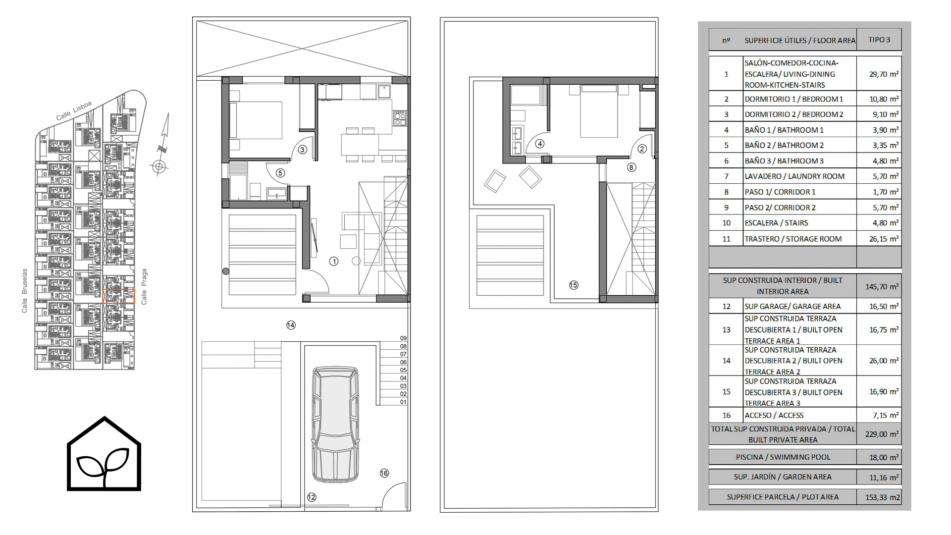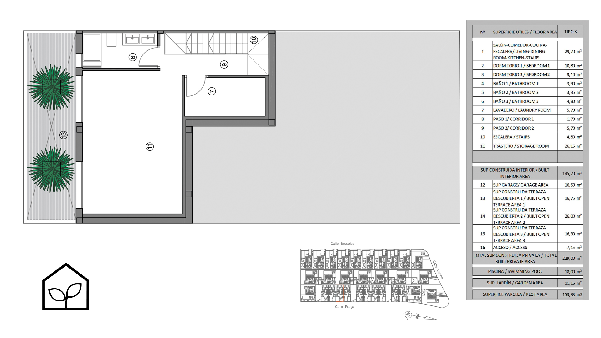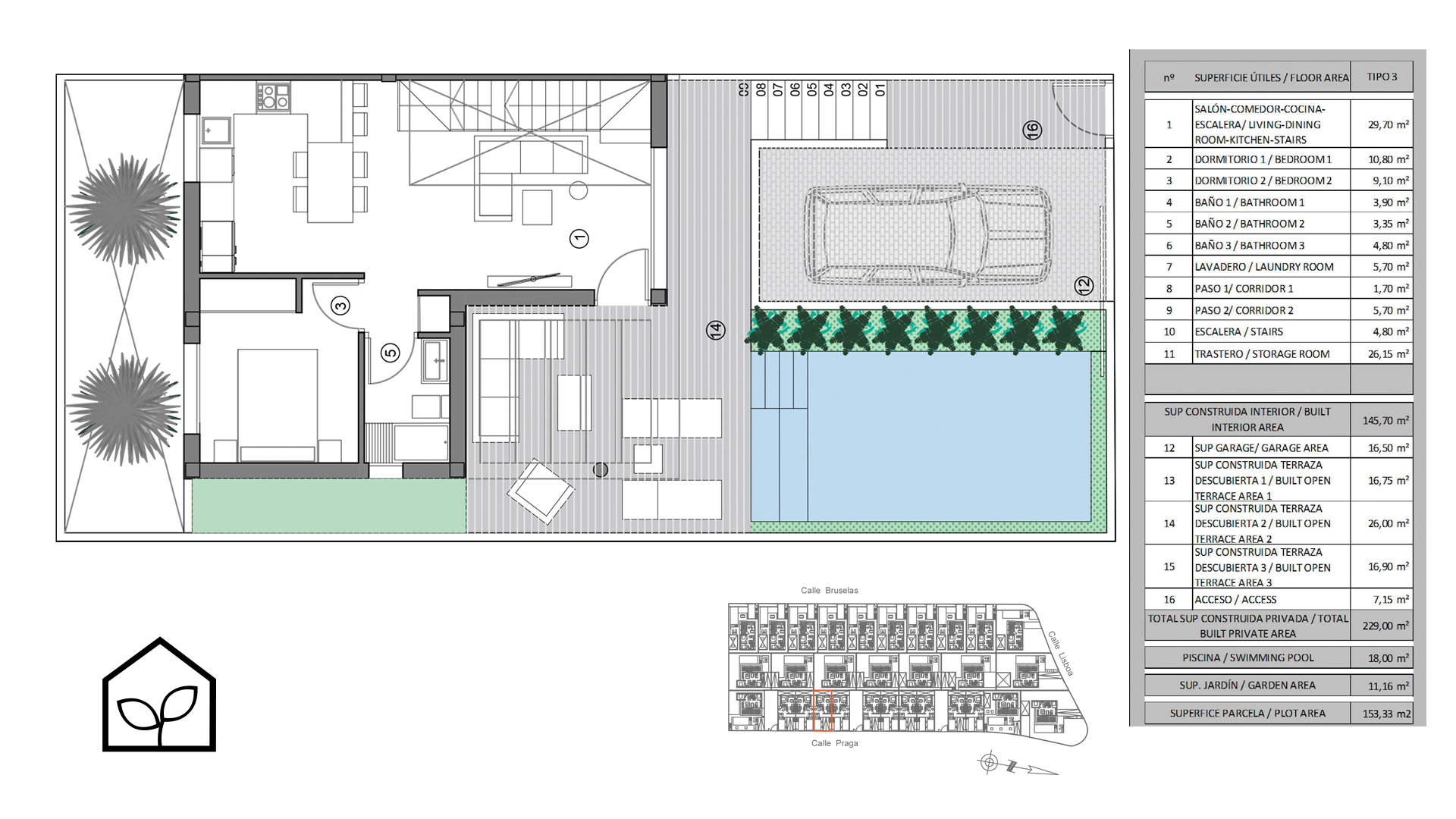 Im Untergeschoss befindet sich ein vielseitig nutzbarer Raum von 26,15 m² mit Patio sowie eine separate Waschküche von 5,70 m². Dank natürlichem Lichteinfall und eines voll ausgestatteten Badezimmers lässt sich dieser Bereich problemlos als zusätzliches Schlafzimmer, Fitnessraum, Spielzimmer, Homeoffice oder privater Gästebereich nutzen. Ein Stellplatz ist auf dem Grundstück vorgesehen. Das private Grundstück von 153,33 m² umfasst einen eigenen Pool von 18,00 m².