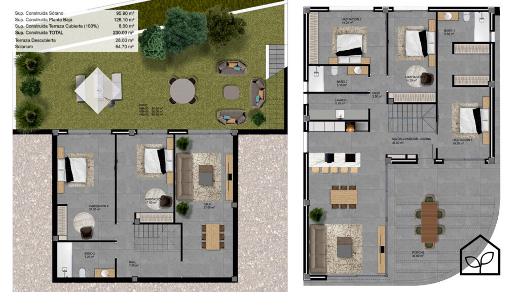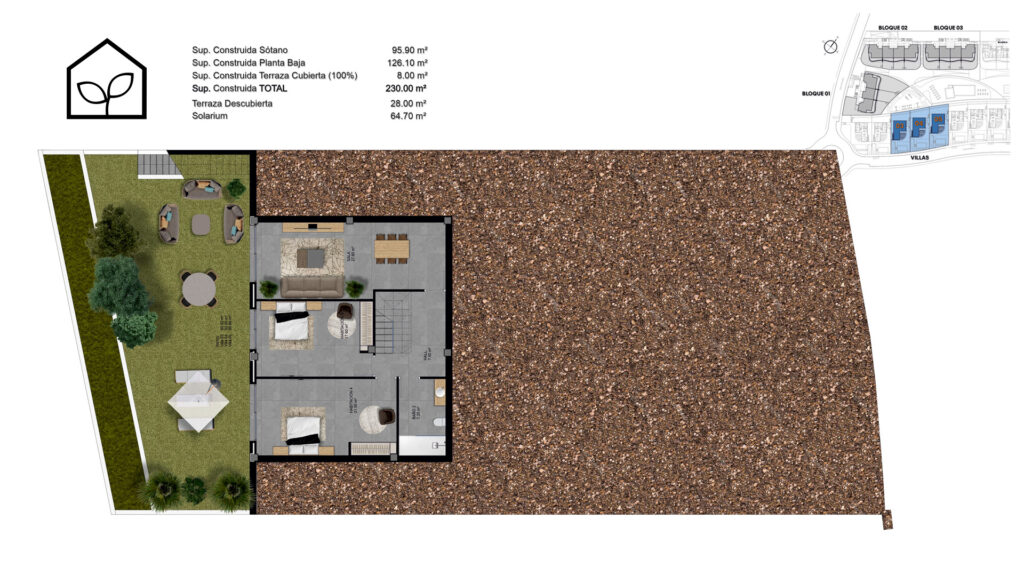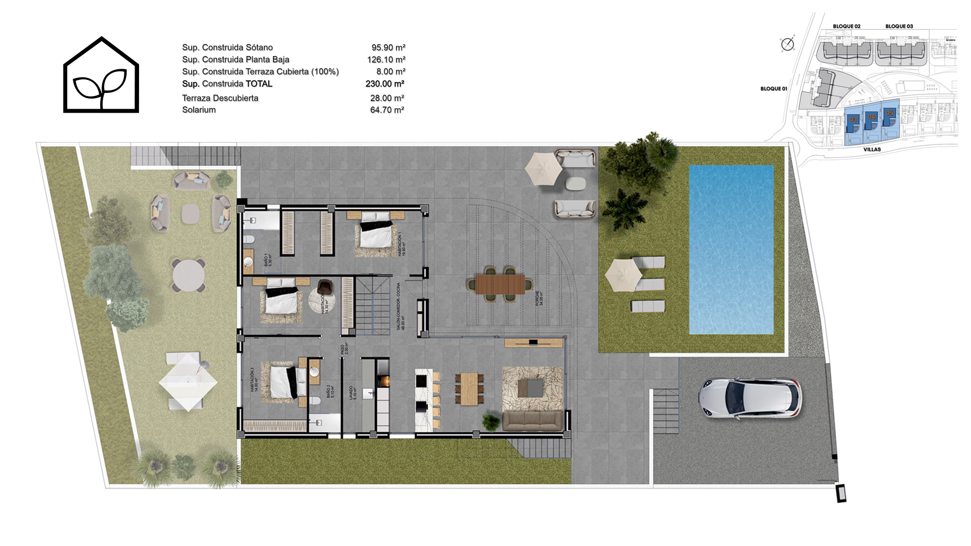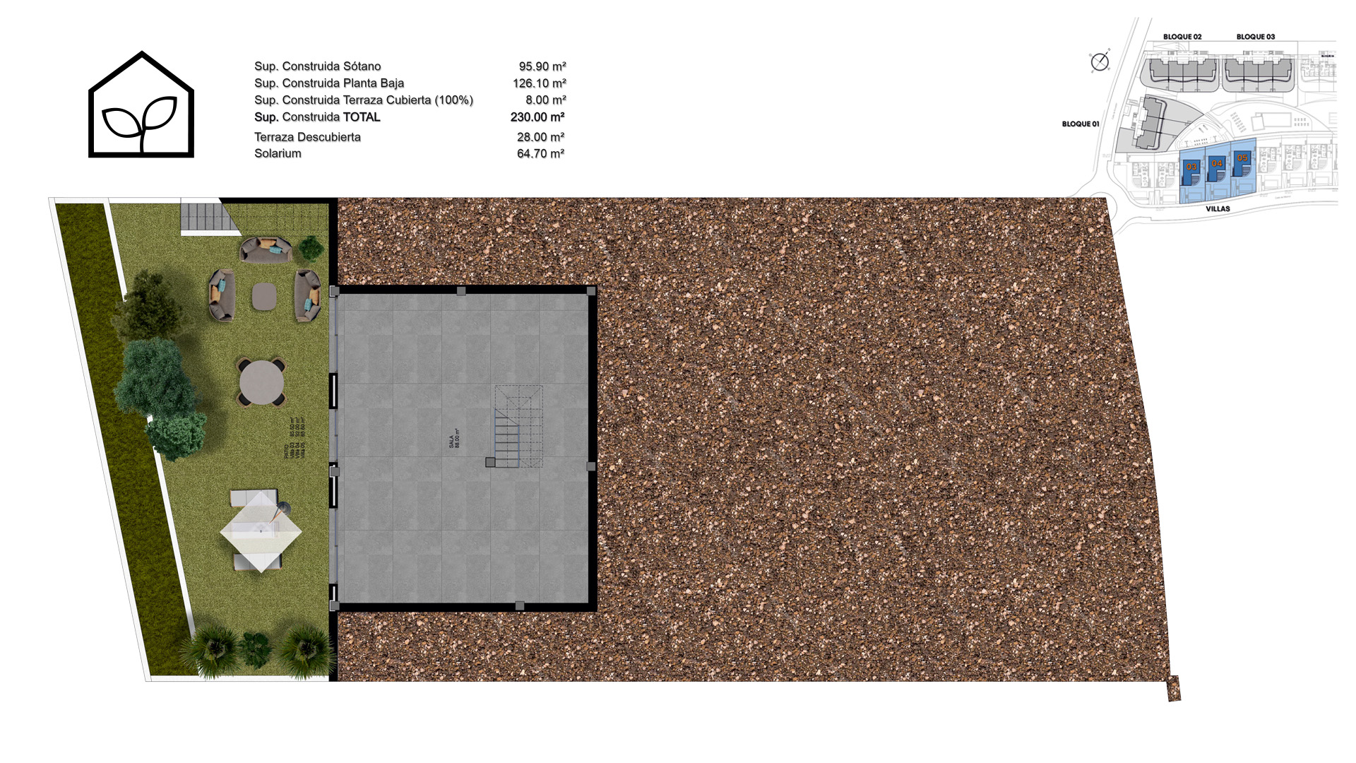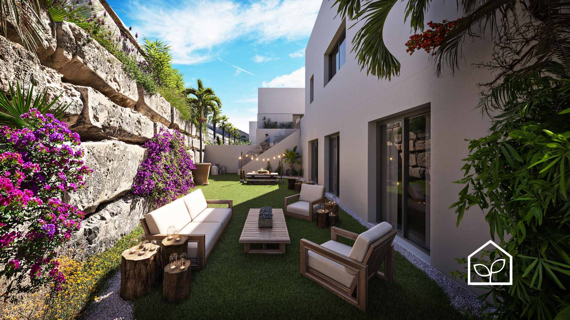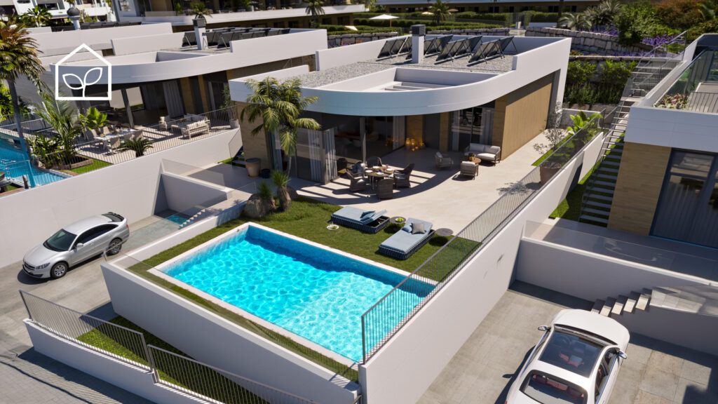 La parcela ha sido organizada con un planteamiento funcional y fácil de mantener. Incluye una piscina de 8 × 4 m y un jardín de inspiración mediterránea pensado para requerir un mantenimiento mínimo. Los pavimentos exteriores han sido seleccionados para un uso adecuado en espacios al aire libre. También se ha previsto la preinstalación para punto de recarga de vehículo eléctrico.