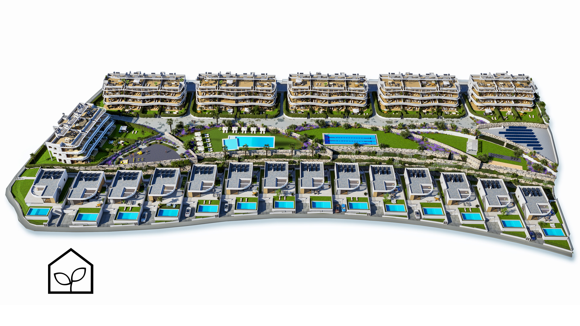 La arquitectura y las soluciones constructivas han sido concebidas para ofrecer durabilidad, solidez y un alto confort de uso. La estructura portante de hormigón armado y los cerramientos con un eficaz aislamiento térmico y acústico favorecen un ambiente interior agradable y equilibrado durante todo el año. En las fachadas se combinan porcelánicos de gran formato con acabado efecto madera, revestimientos minerales claros con propiedades hidrófugas y elementos decorativos en contraste que refuerzan la estética contemporánea del conjunto. Las carpinterías de PVC con persianas motorizadas mejoran la eficiencia energética y el confort acústico. Los interiores se presentan en una gama neutra y actual, con pavimentos cerámicos de gran formato, paramentos lisos pintados y armarios empotrados. La cocina está equipada con una cuidada solución de almacenaje, encimera de piedra artificial y electrodomésticos integrados. Los baños incorporan sanitarios suspendidos, mobiliario y duchas con platos antideslizantes.