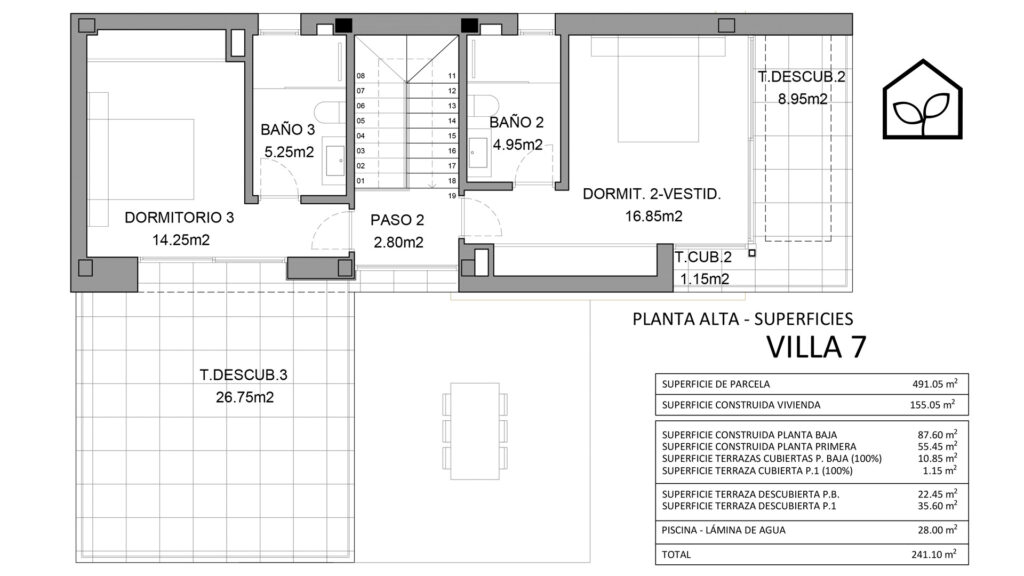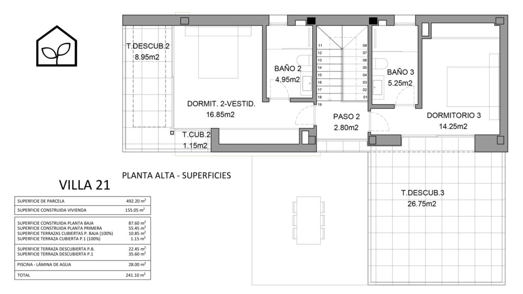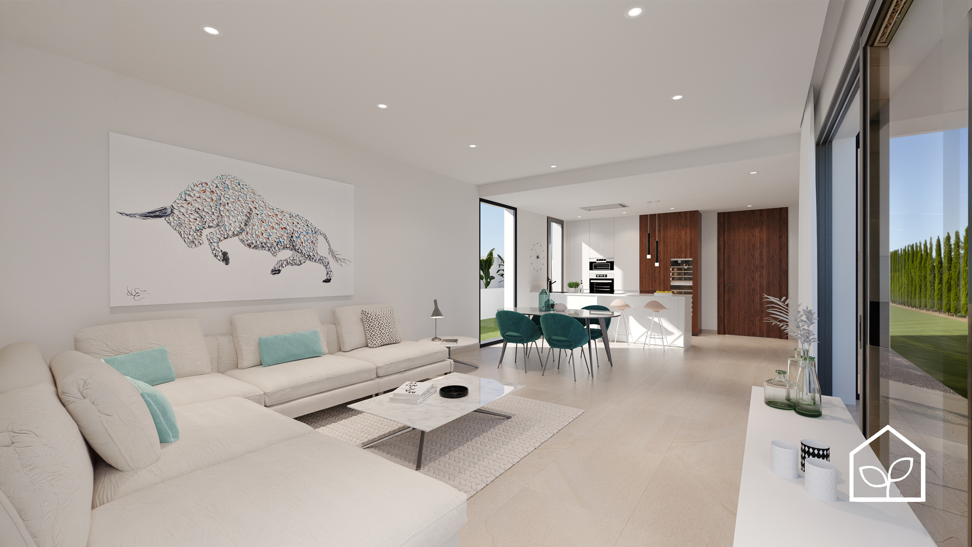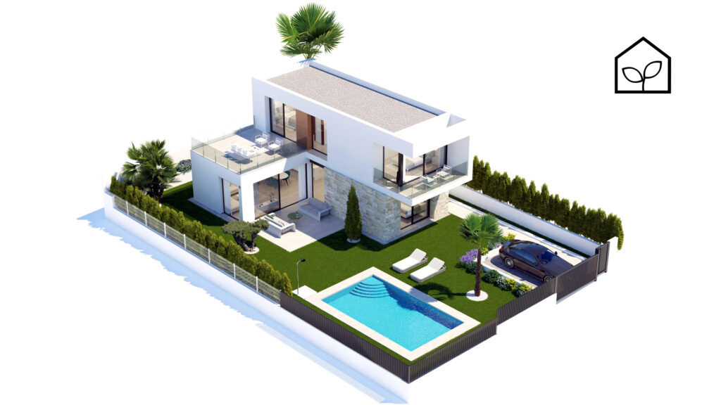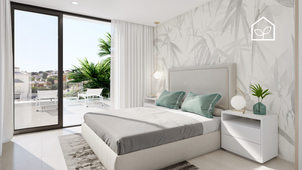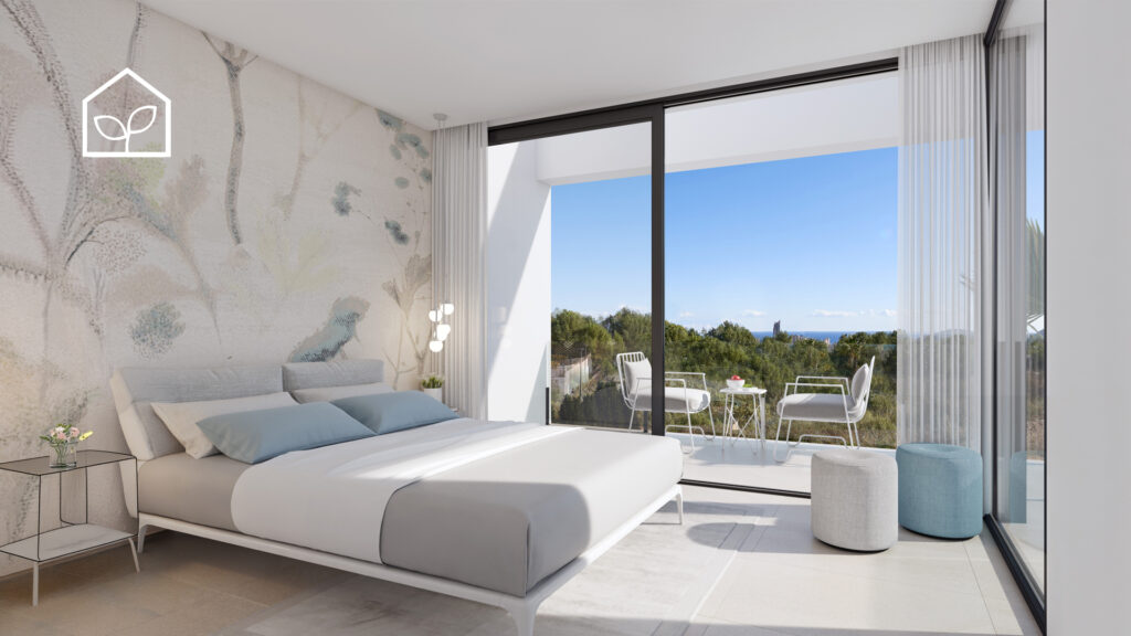 Las viviendas cuentan con tres amplios dormitorios y tres baños. En la planta principal se ubican un dormitorio, un baño, zona de lavandería y un espectacular espacio abierto de salón, comedor y cocina integrada con superficies que oscilan entre 48,45 m² y 51,60 m², concebido como el verdadero núcleo de la vida diaria. La planta superior está destinada a la zona más privada, con dos luminosos dormitorios, dos baños y terrazas propias. Las parcelas, de entre 492 m² y 531 m², incorporan piscina privada de 28 m² y una cuidada zona exterior pensada para el descanso.