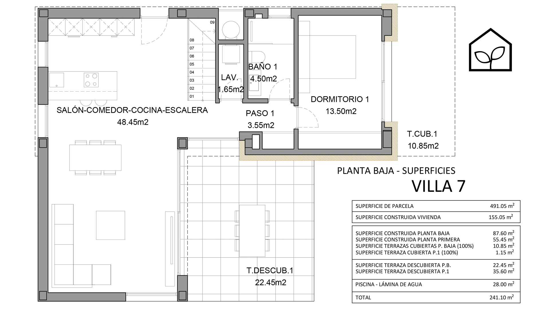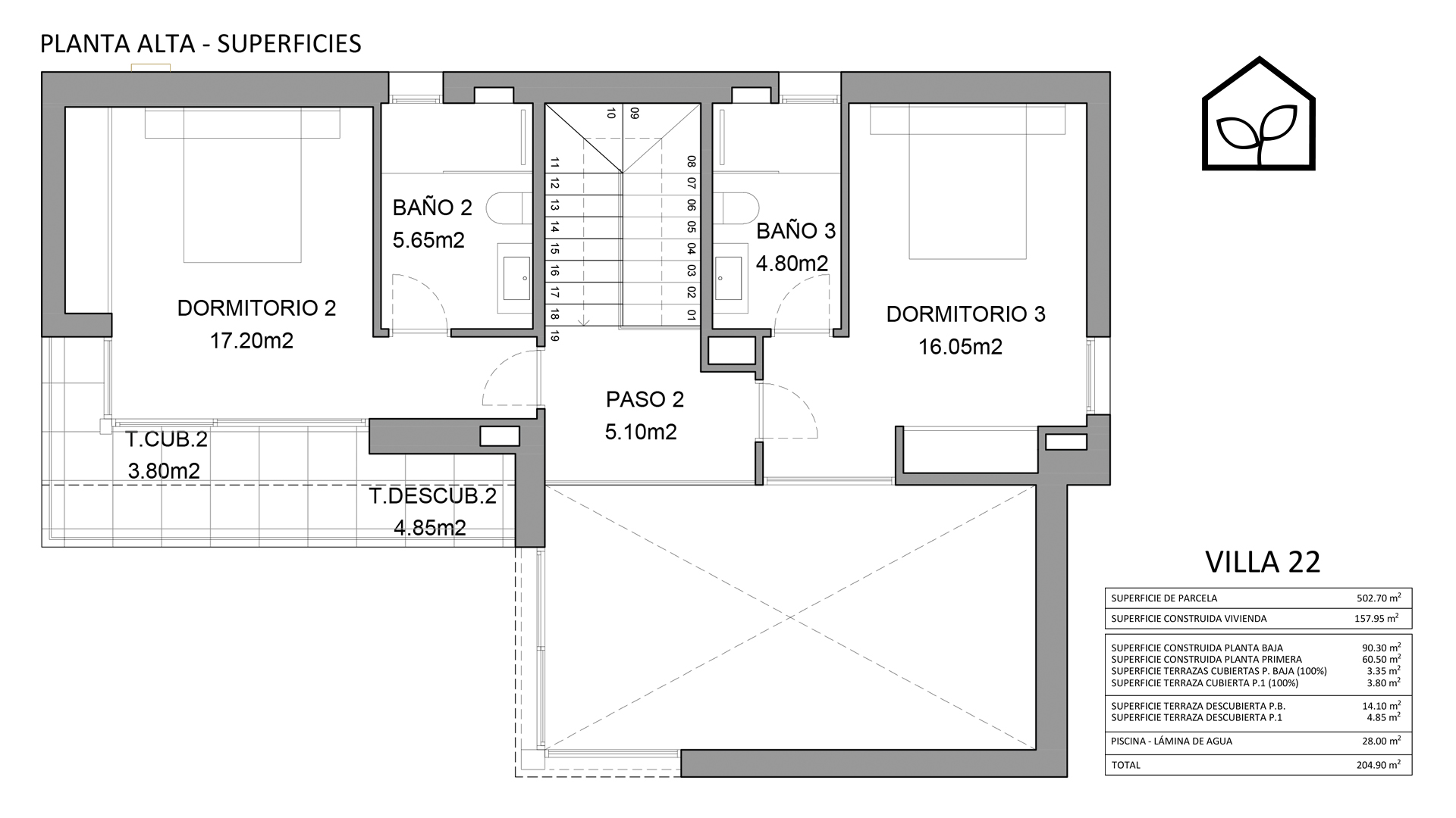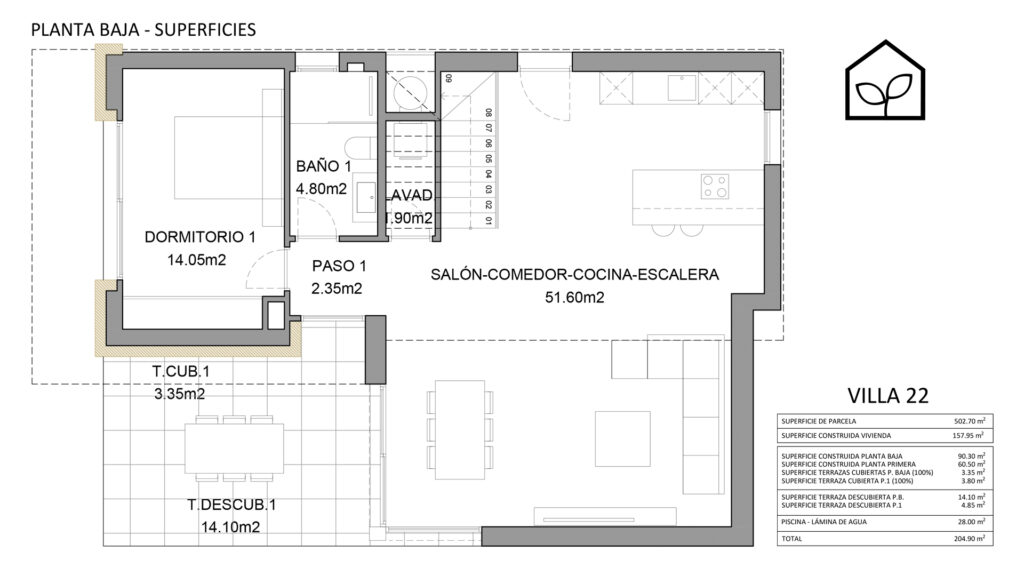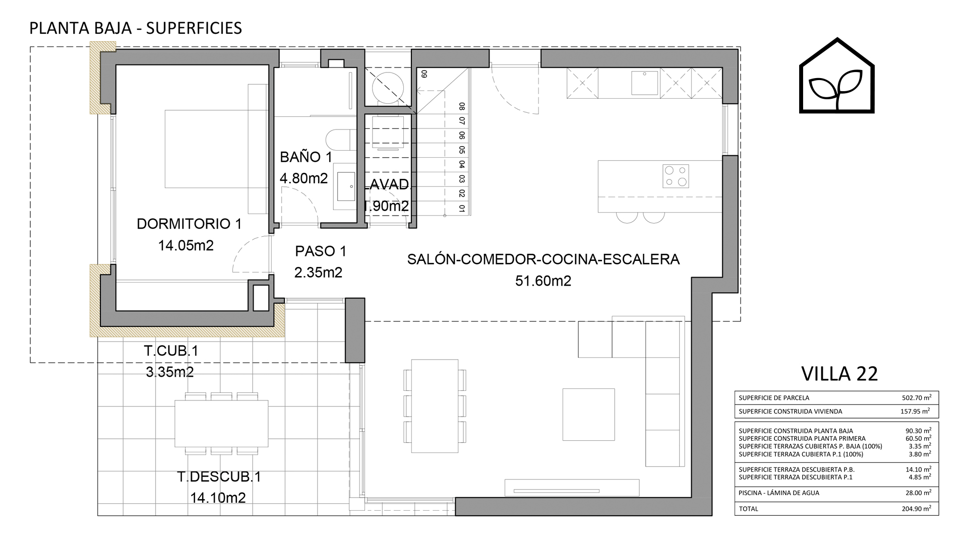 Las viviendas cuentan con tres amplios dormitorios y tres baños. En la planta principal se ubican un dormitorio, un baño, zona de lavandería y un espectacular espacio abierto de salón, comedor y cocina integrada con superficies que oscilan entre 48,45 m² y 51,60 m², concebido como el verdadero núcleo de la vida diaria. La planta superior está destinada a la zona más privada, con dos luminosos dormitorios, dos baños y terrazas propias. Las parcelas, de entre 492 m² y 531 m², incorporan piscina privada de 28 m² y una cuidada zona exterior pensada para el descanso.