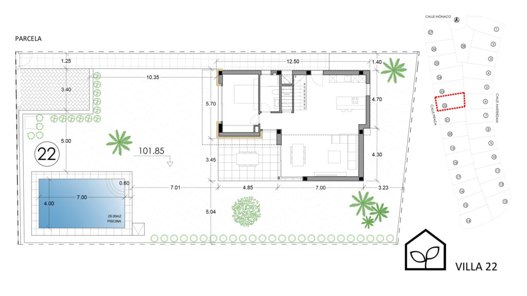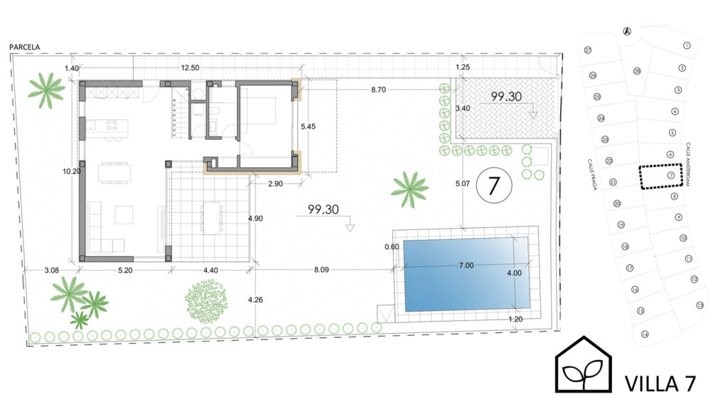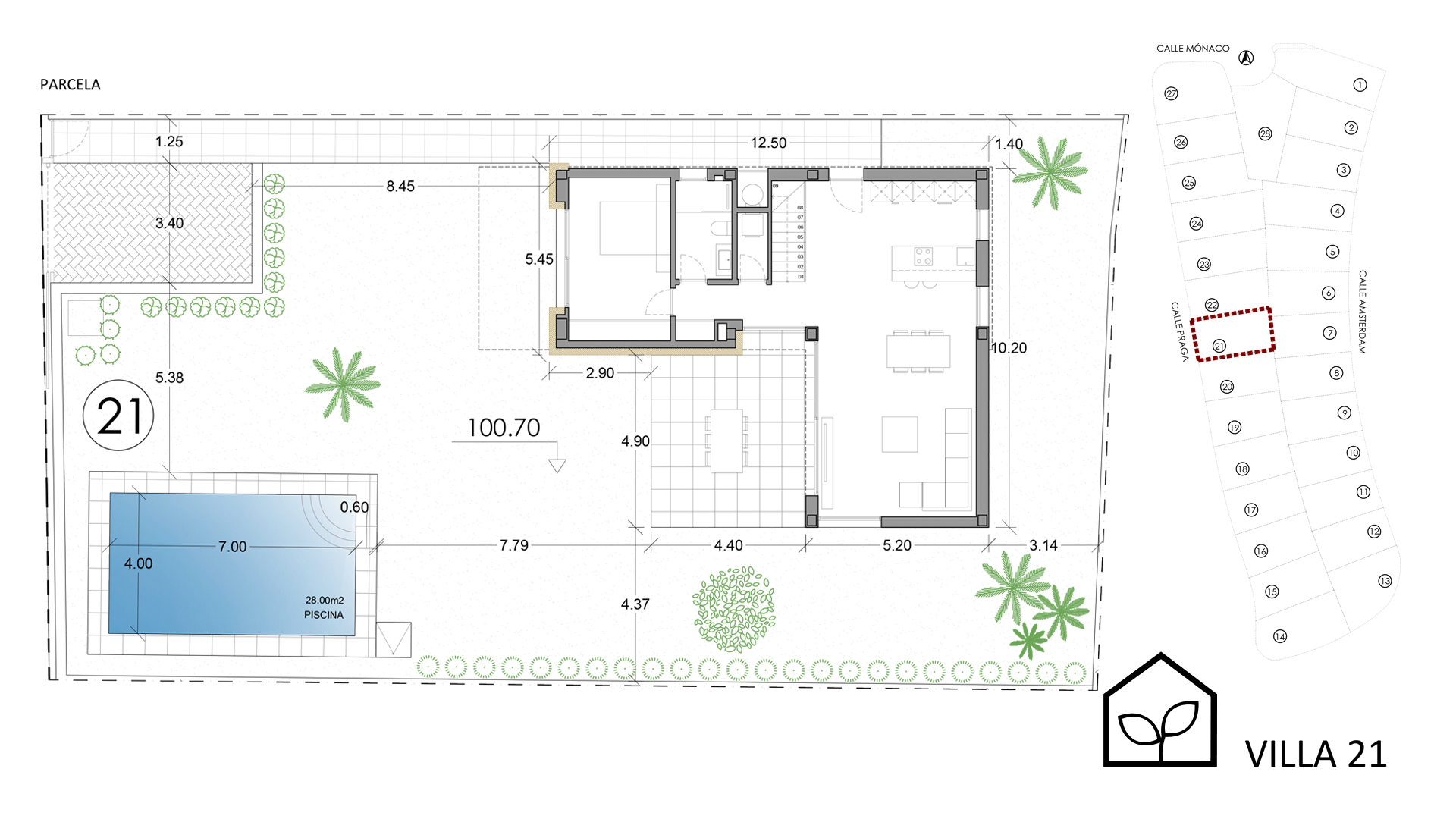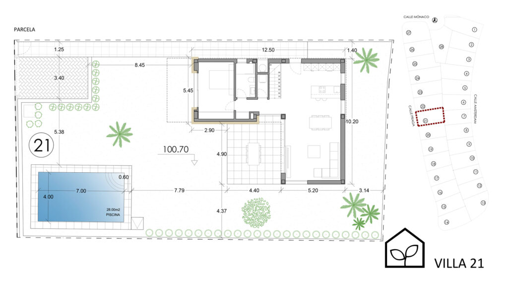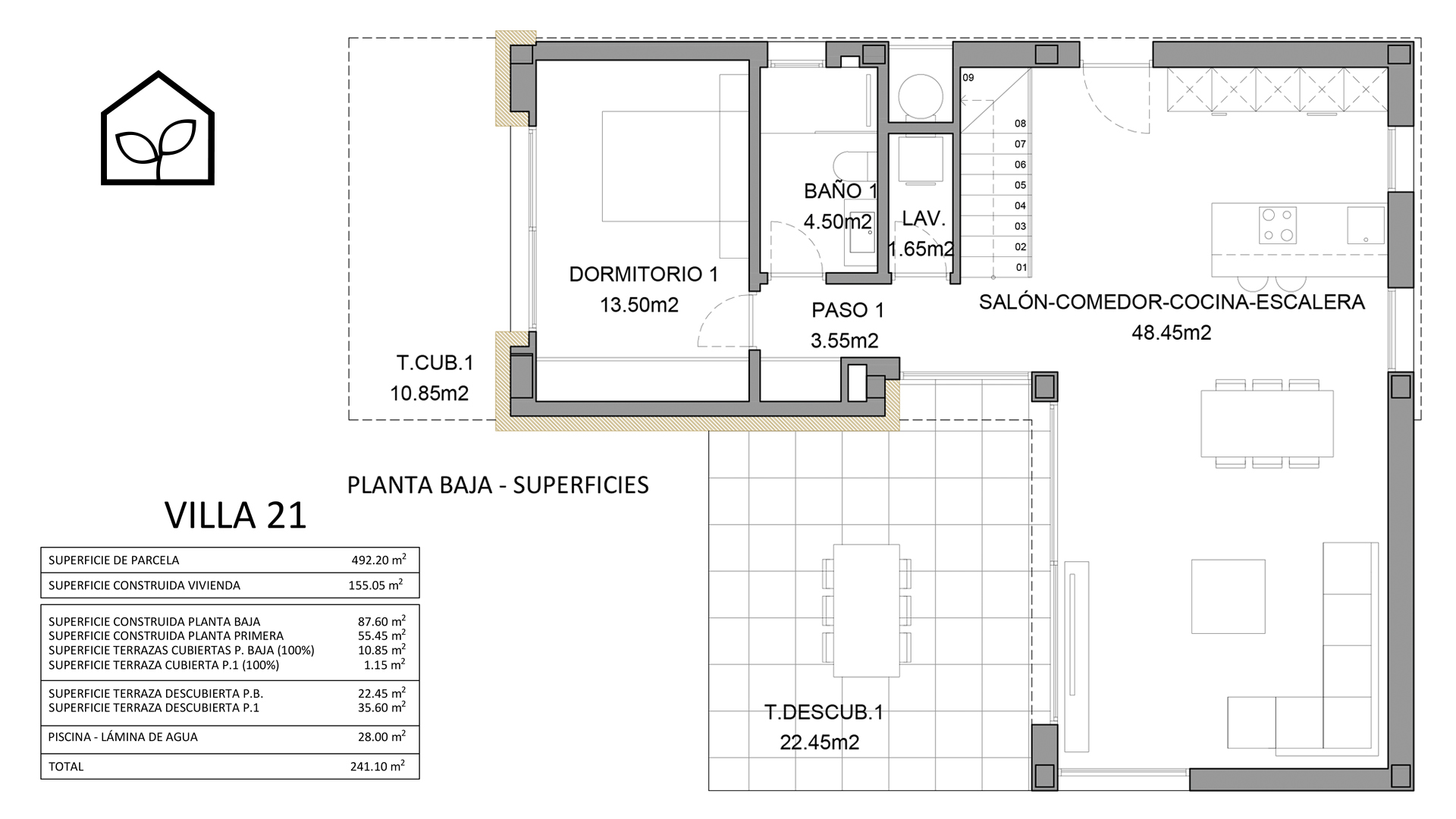 Las viviendas cuentan con tres amplios dormitorios y tres baños. En la planta principal se ubican un dormitorio, un baño, zona de lavandería y un espectacular espacio abierto de salón, comedor y cocina integrada con superficies que oscilan entre 48,45 m² y 51,60 m², concebido como el verdadero núcleo de la vida diaria. La planta superior está destinada a la zona más privada, con dos luminosos dormitorios, dos baños y terrazas propias. Las parcelas, de entre 492 m² y 531 m², incorporan piscina privada de 28 m² y una cuidada zona exterior pensada para el descanso.