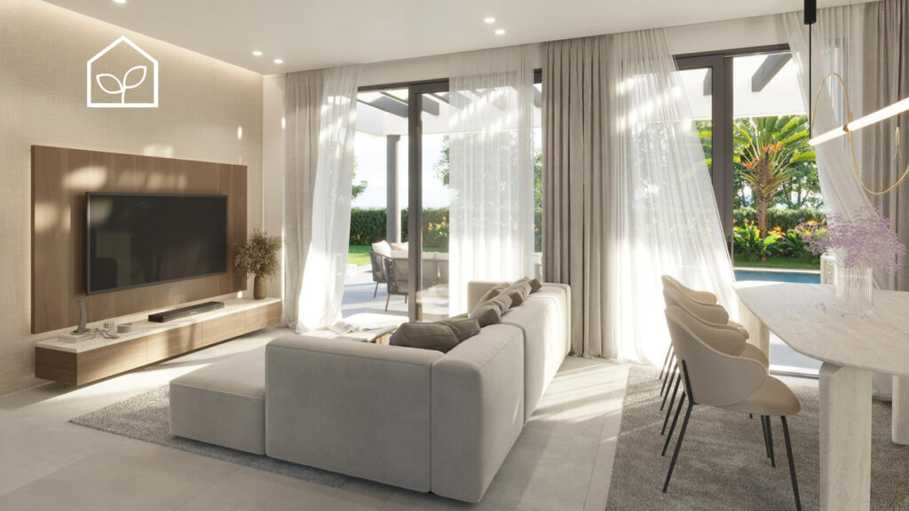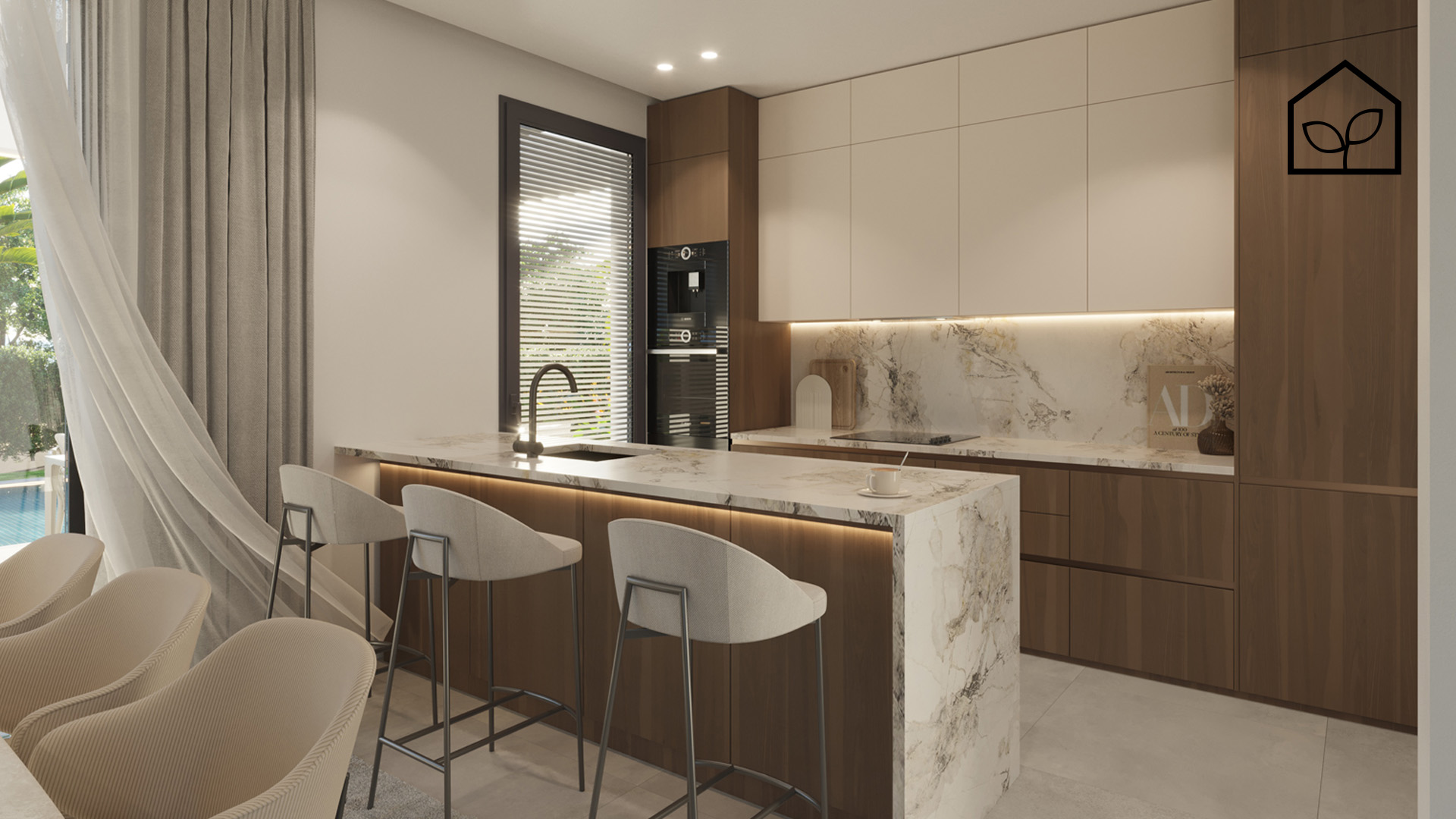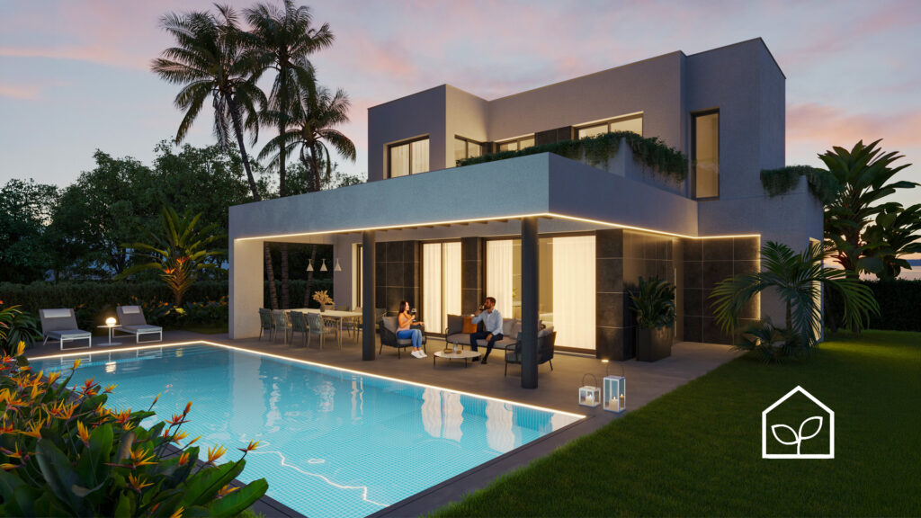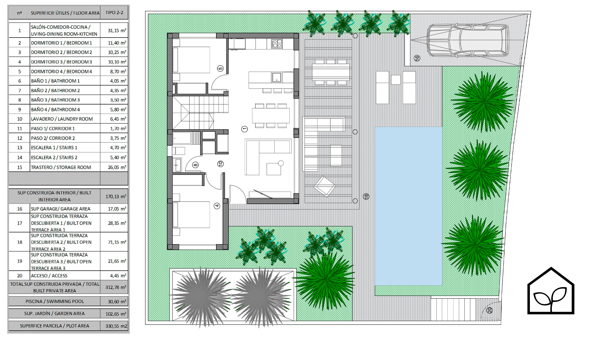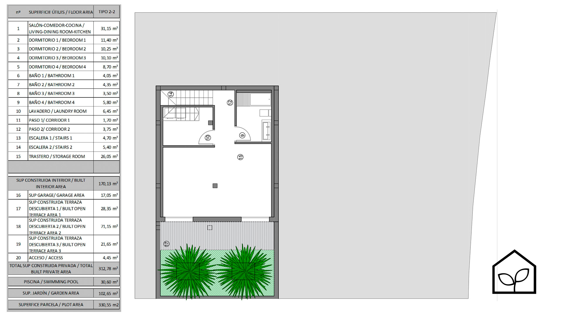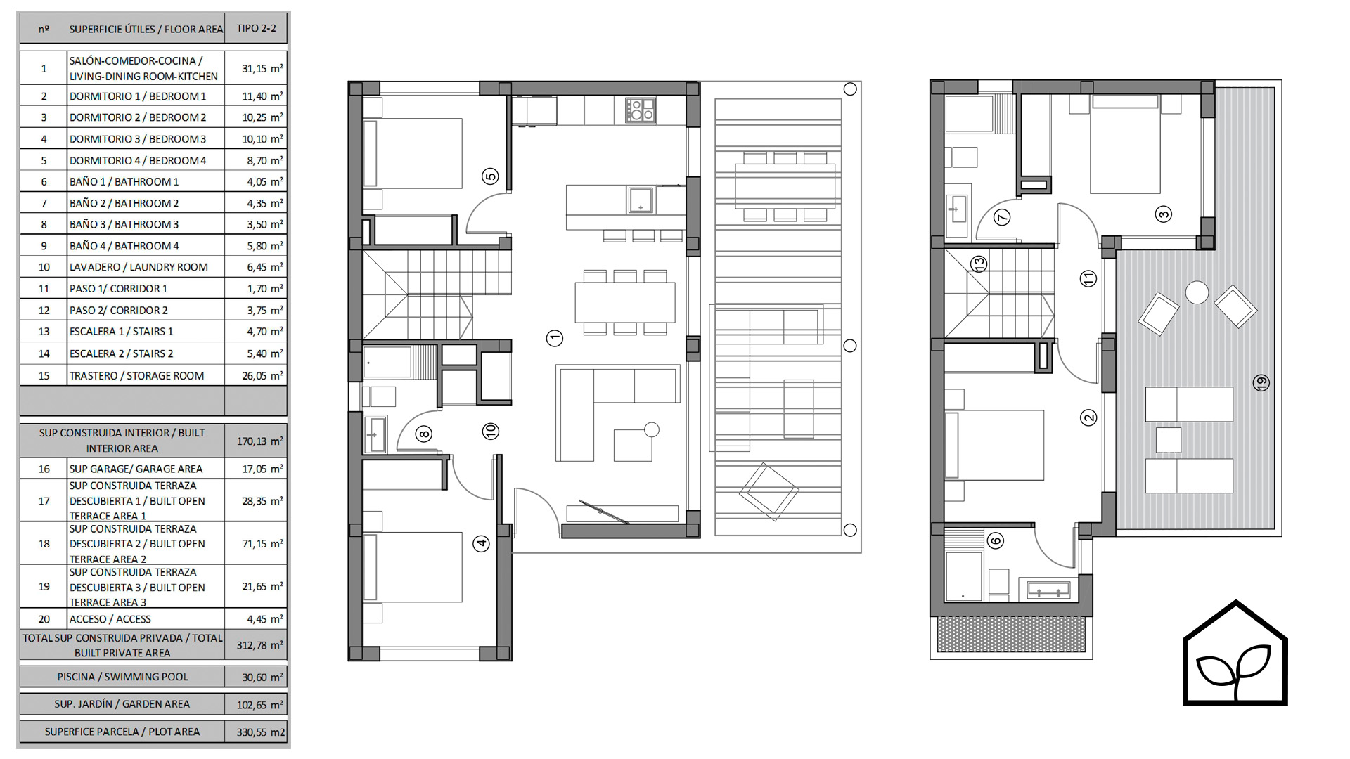 Четыре спальные комнаты, одна из которых является suite с собственной ванной комнатой. Салон-столовая-кухня с полностью экипированной американской кухней площадью 31,15 м2. Две спальни на втором жилом уровне имеют доступ на просторную террасу 21,65 м2. Всего в доме четыре ванные комнаты. Также предусмотрены кладовая, прачечная и подвальное многофункциональное помещение 26 м2 с возможностью использования как домашнего кинотеатра, SPA-зоны, винного погреба или тренажерного зала. Зона для паркинга одного автомобиля. Участок 330,55 м2. Бассейн 30,60 м2.